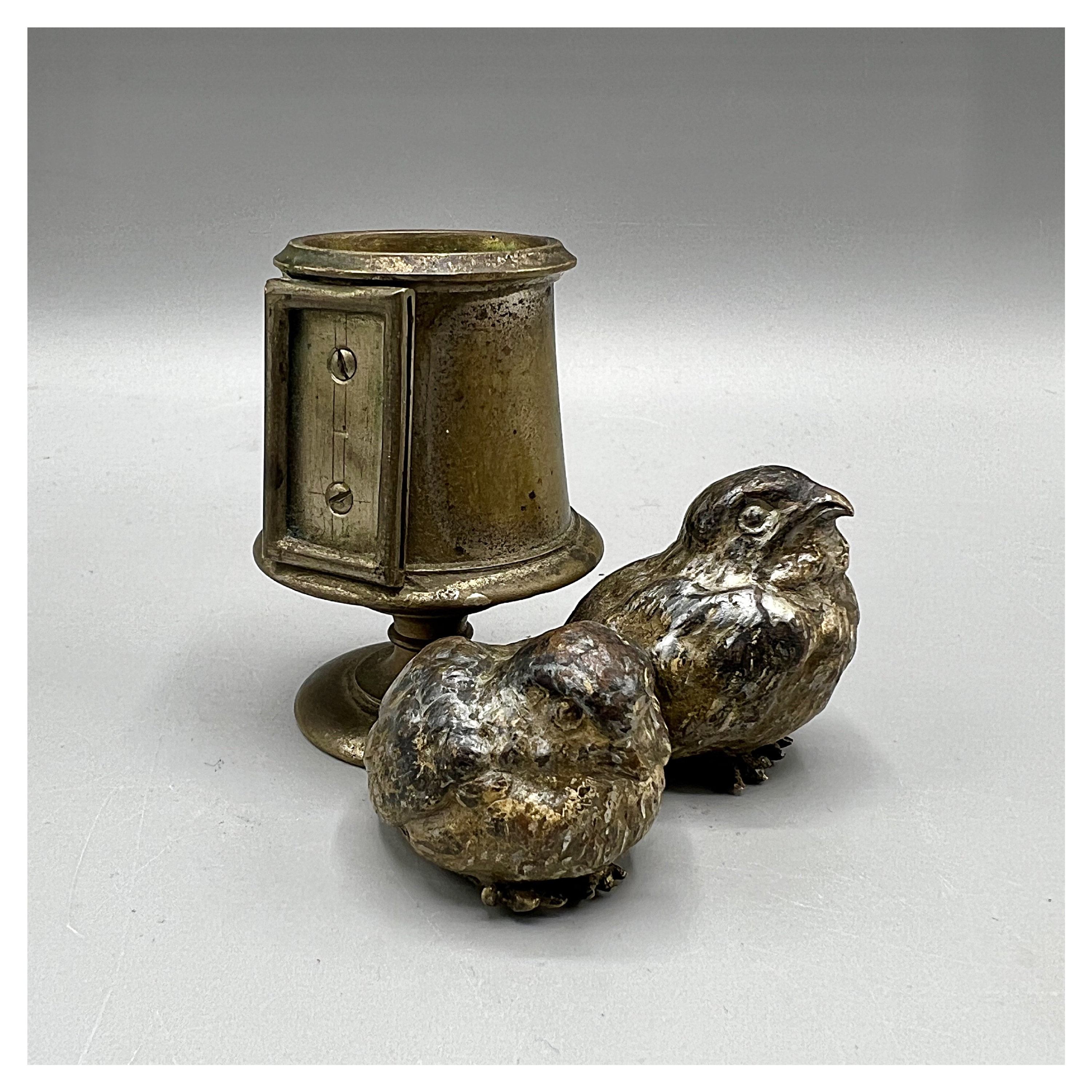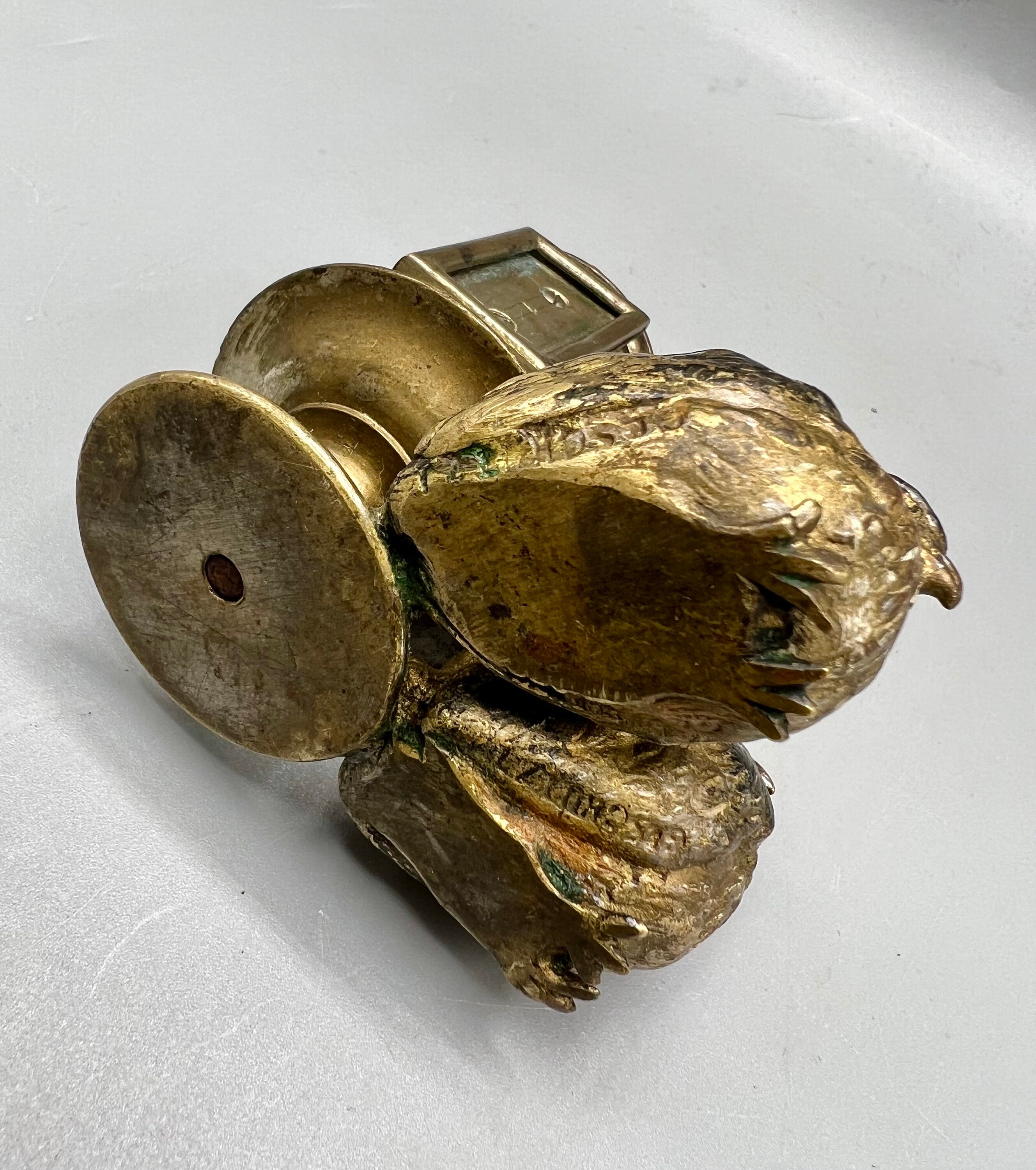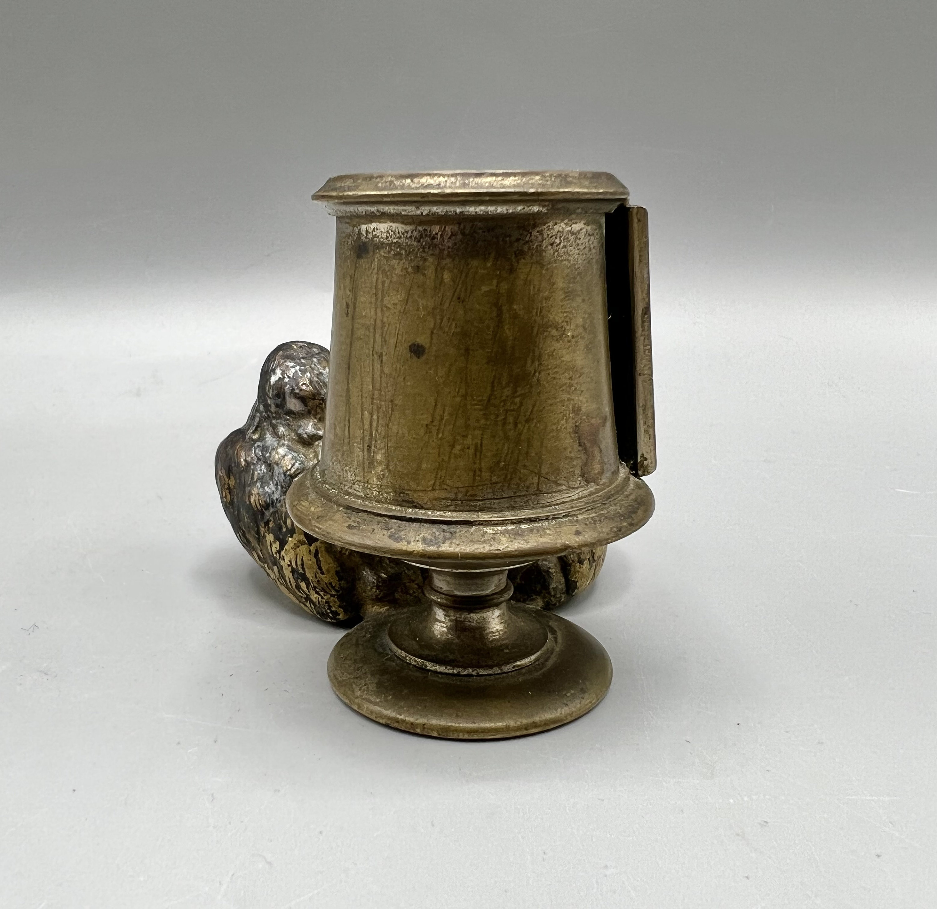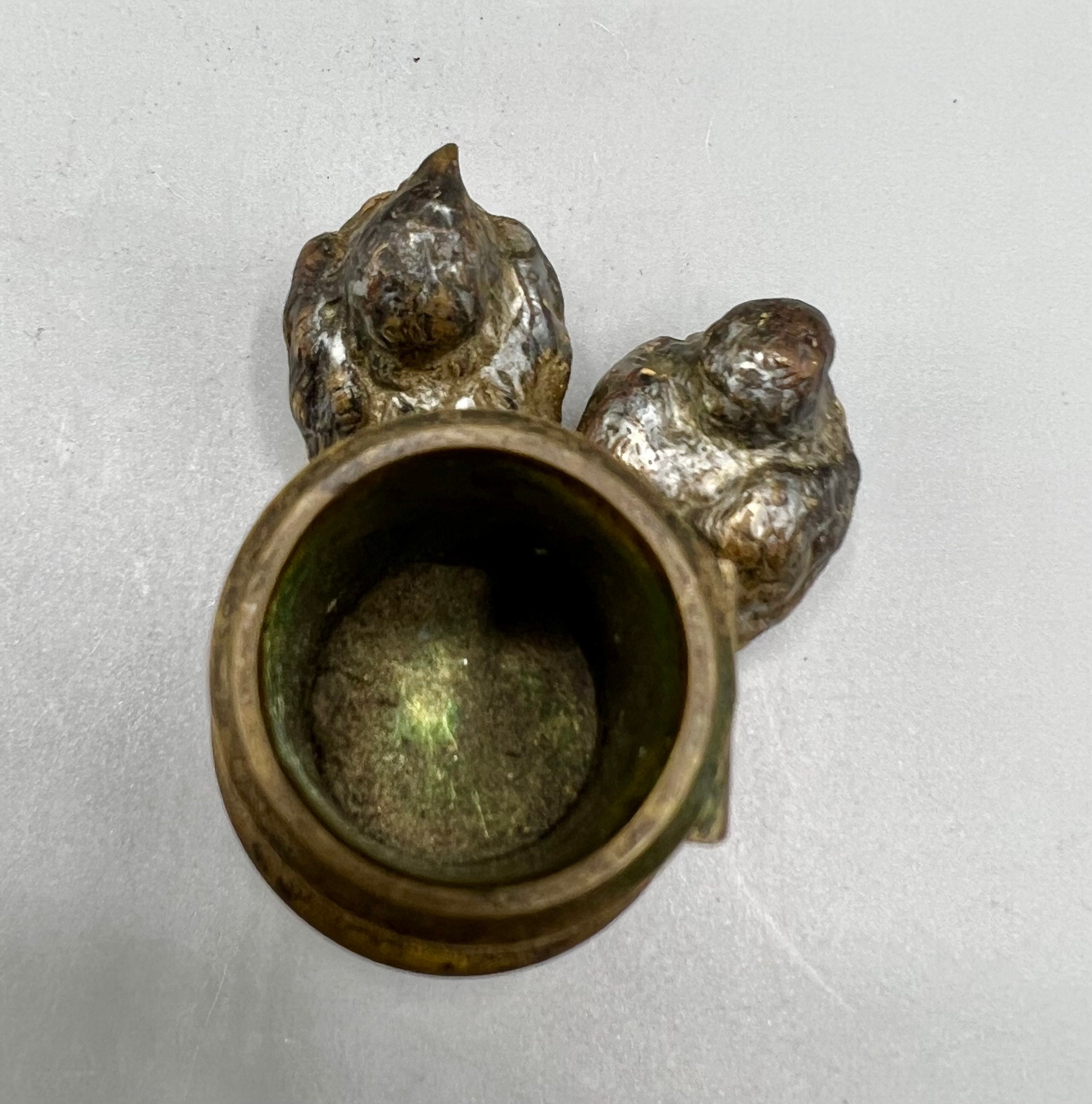 Antique toothpick holder decorated with two cold-painted bronze birds by Geschutzt Depose around the end of the 19th century in Vienna, Austria. The container looks like metal.