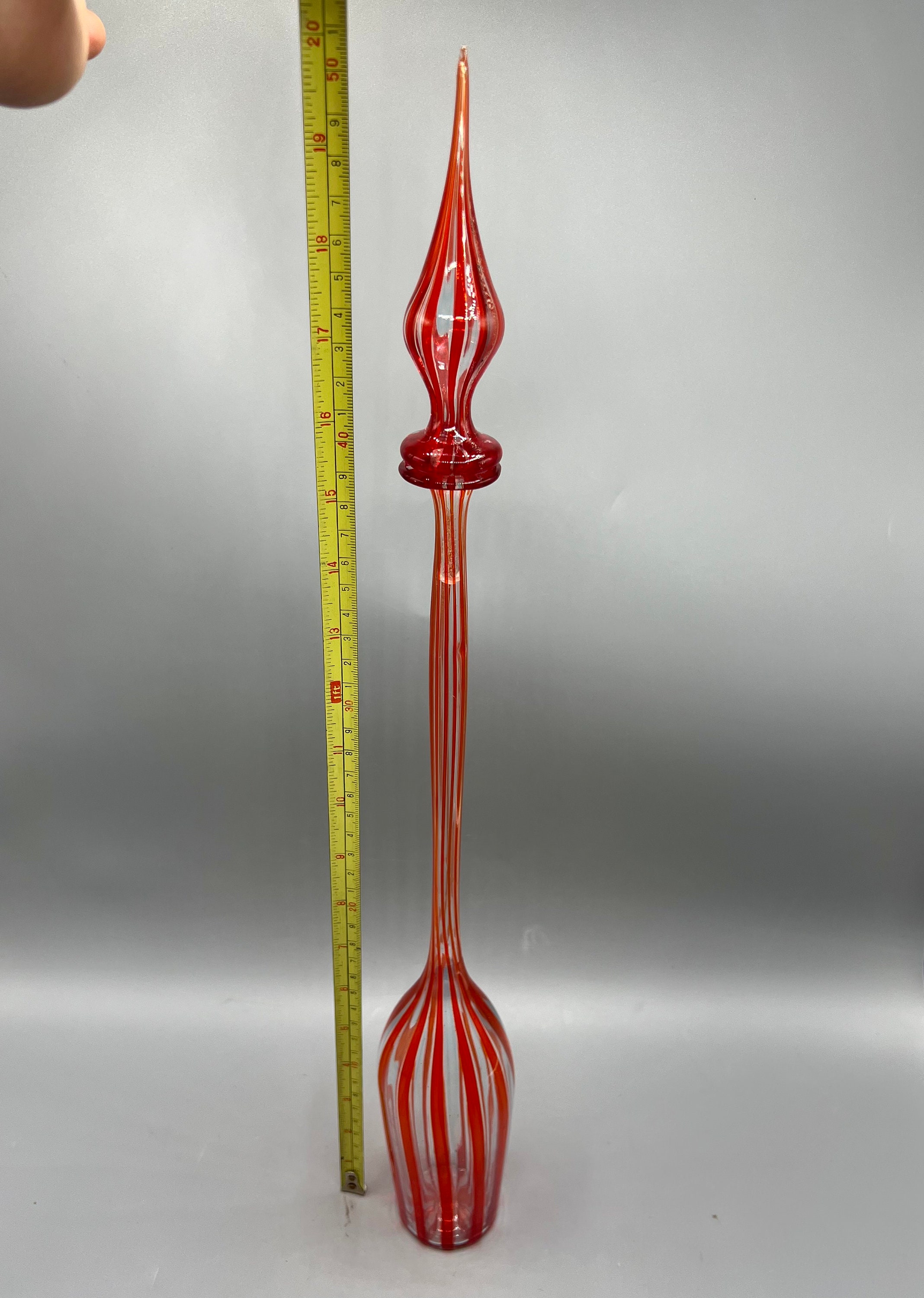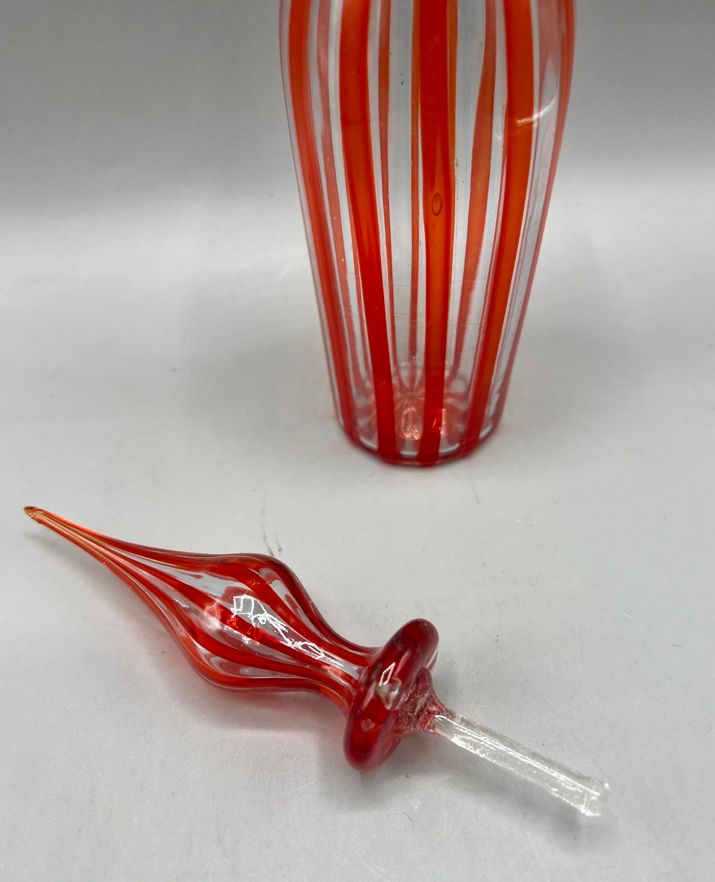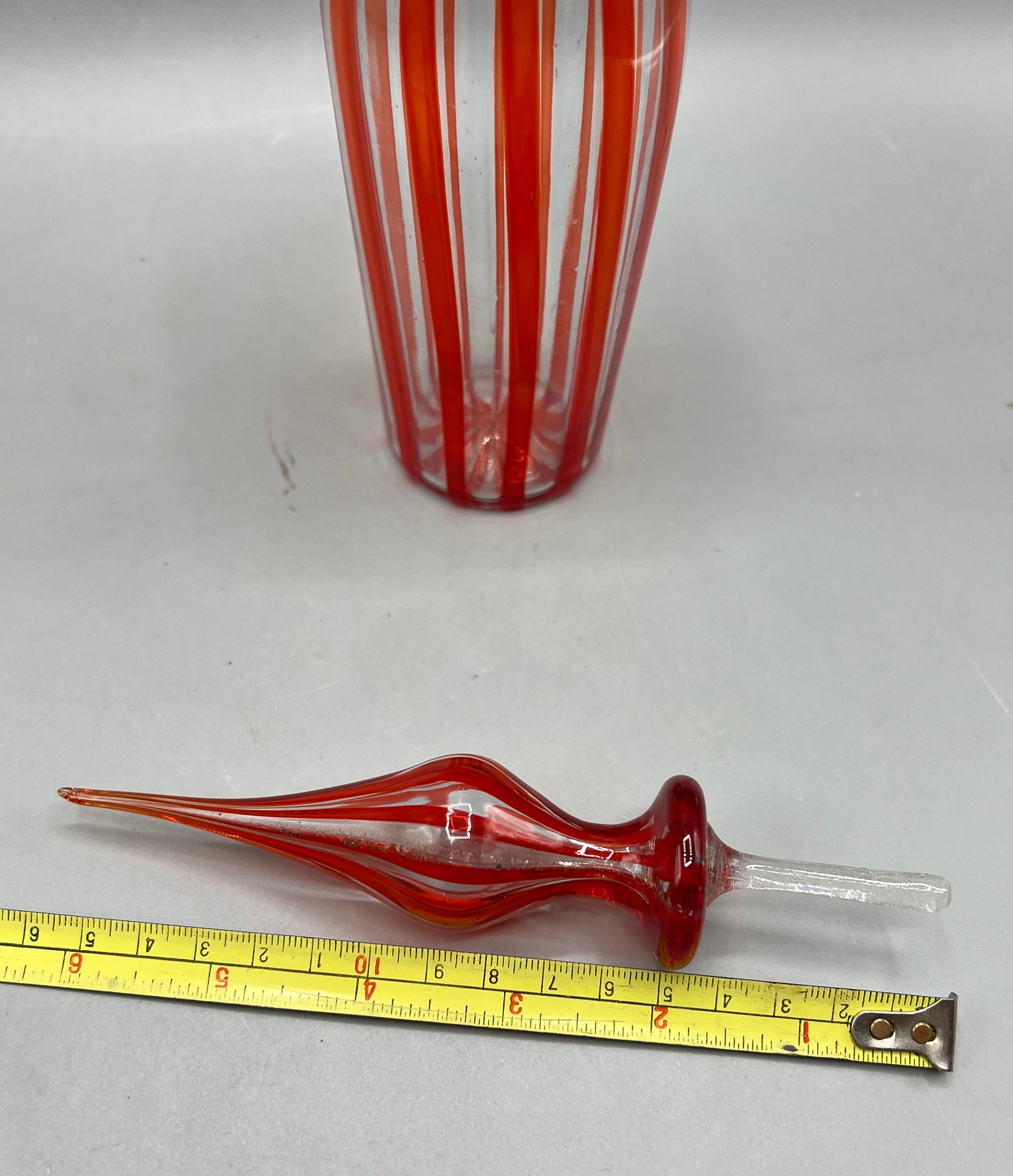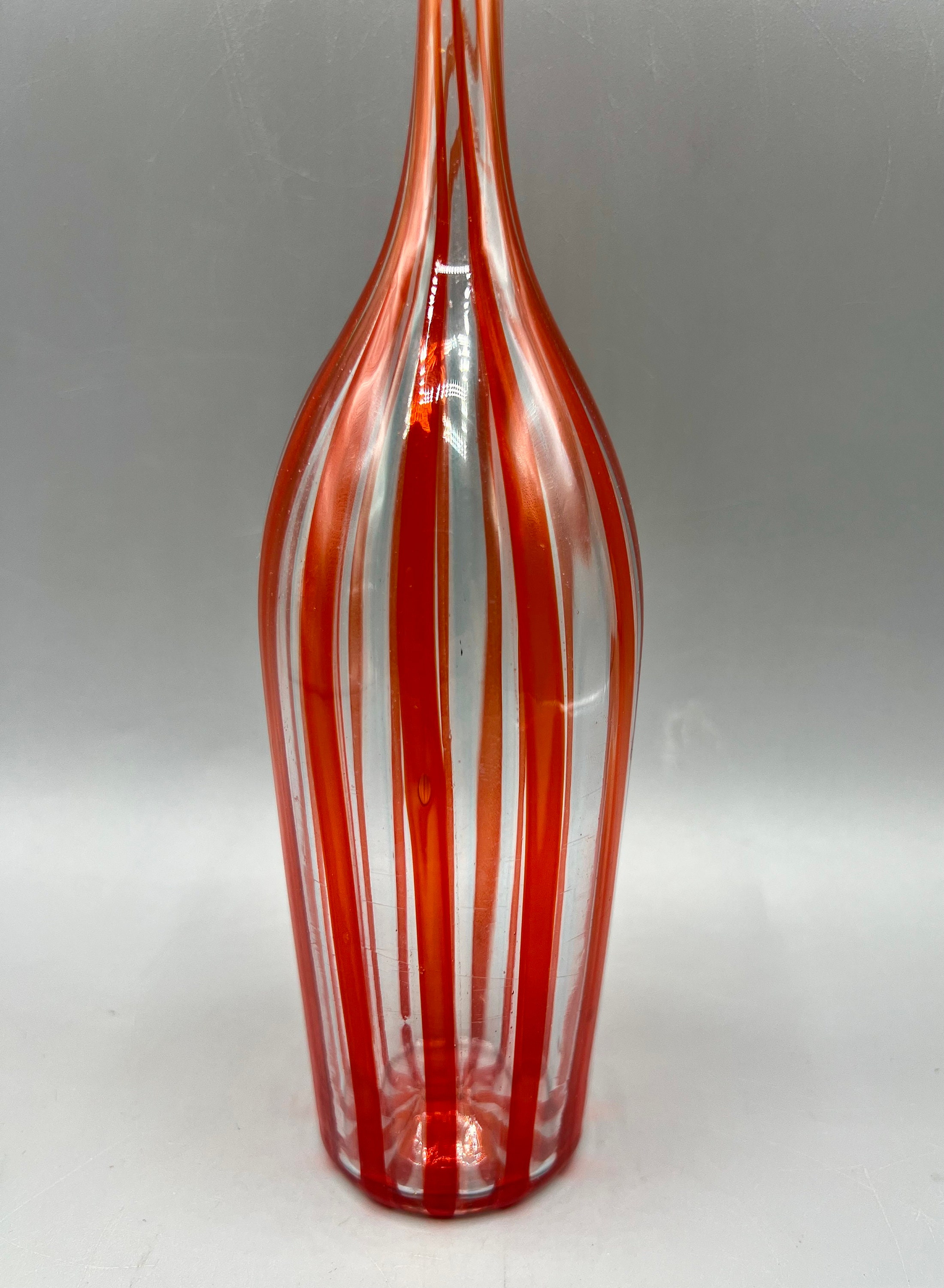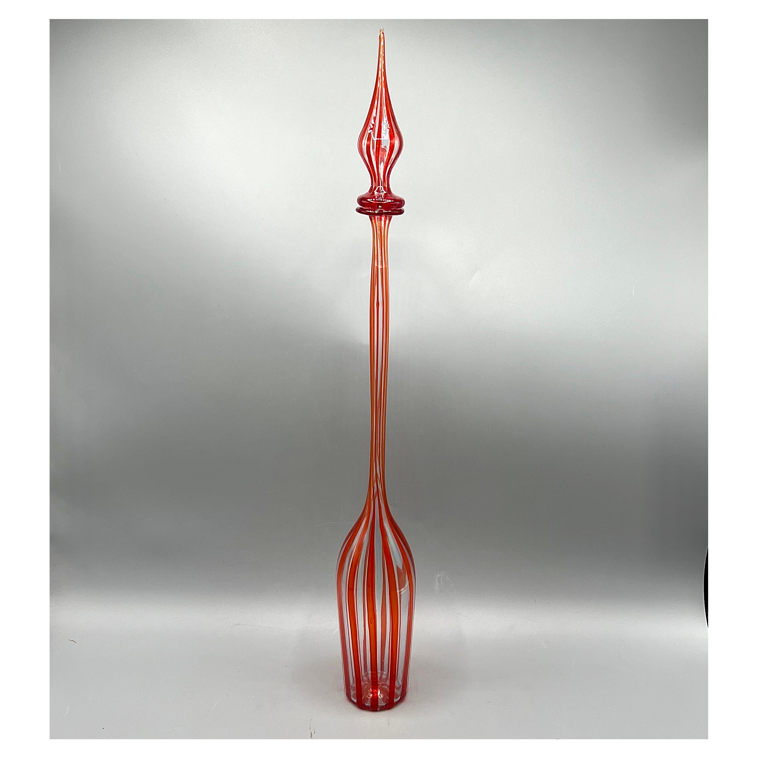 Amazing large bottle or decanter with fine Murano glass decorated in the 'a canne' or 'filigree' style with red and transparent stripes. At the base of the decanter you can see the pontil mark as it is a handmade and unique piece. It is undoubtedly the work of some great artisan or Murano glassmaker such as Fratelli Toso, Venini, Barbini or another important glassworks in Italy.