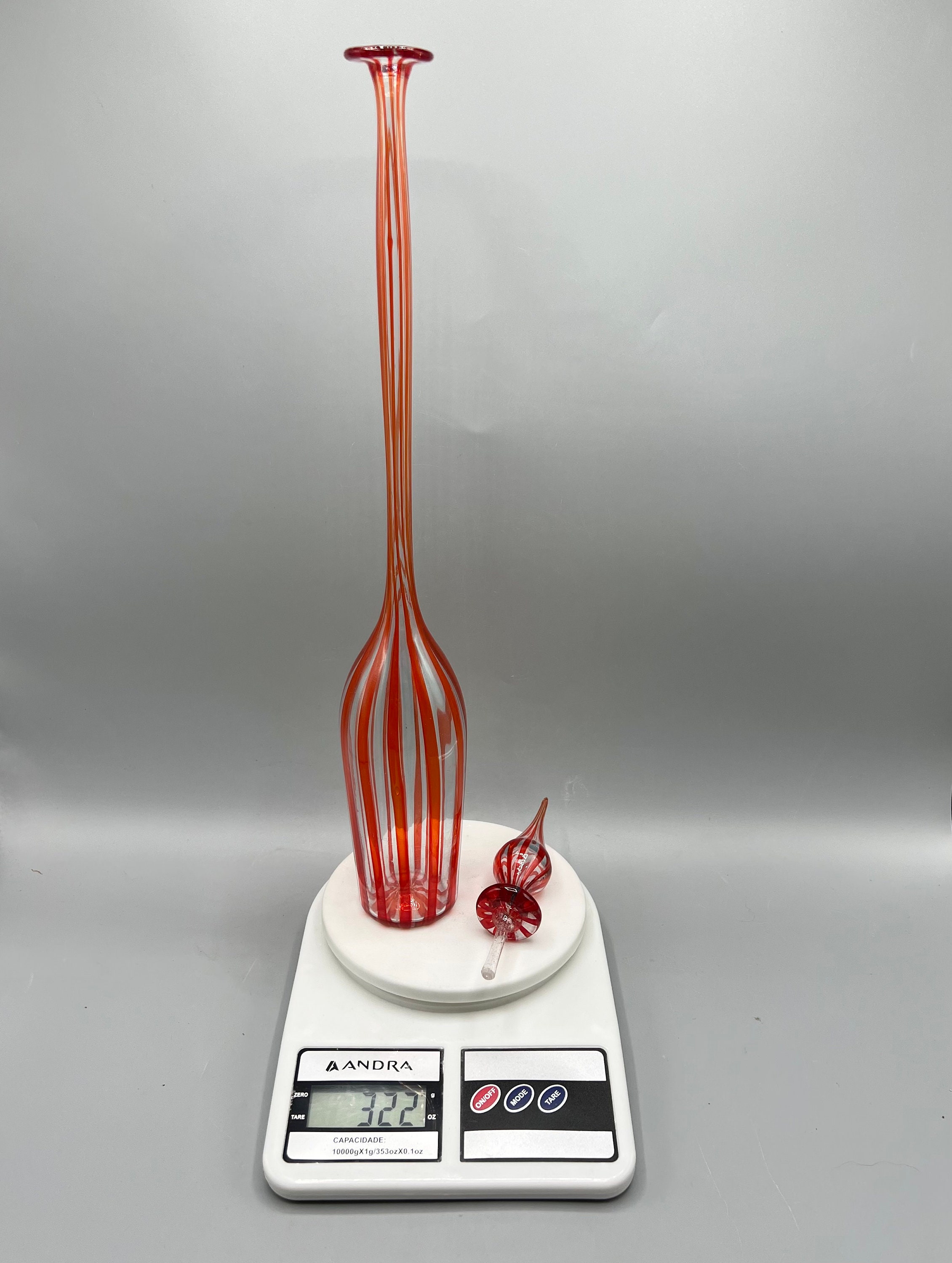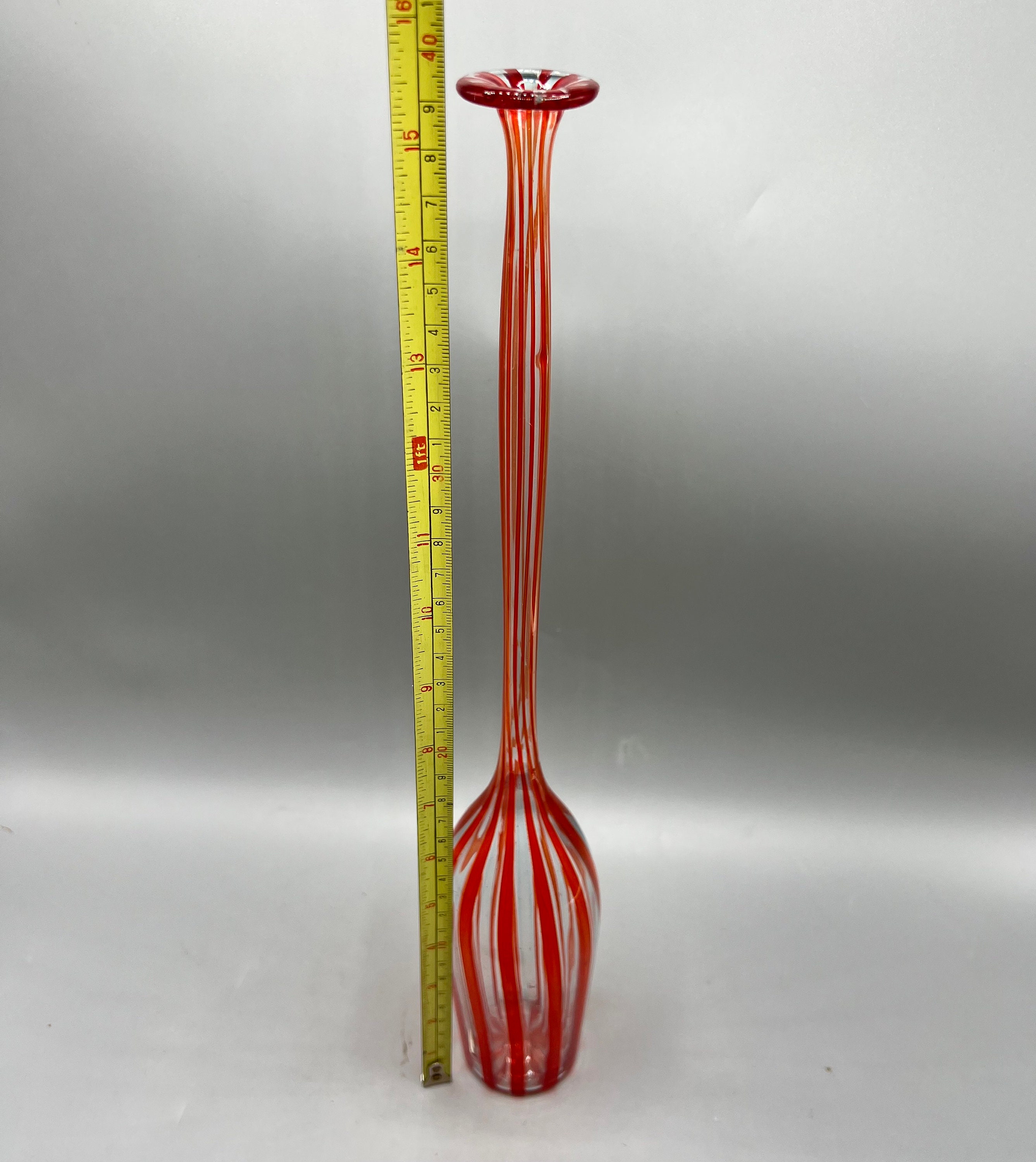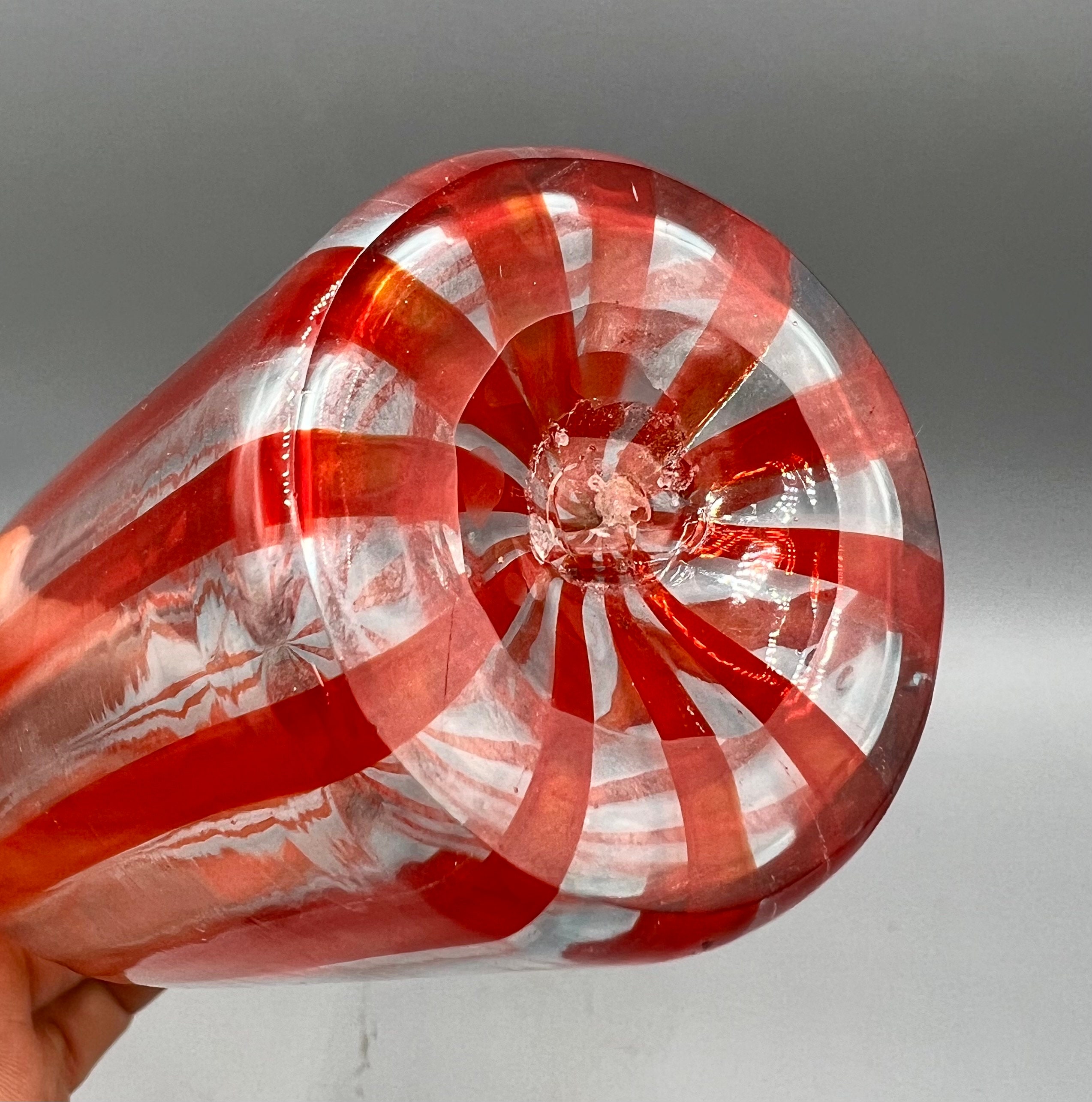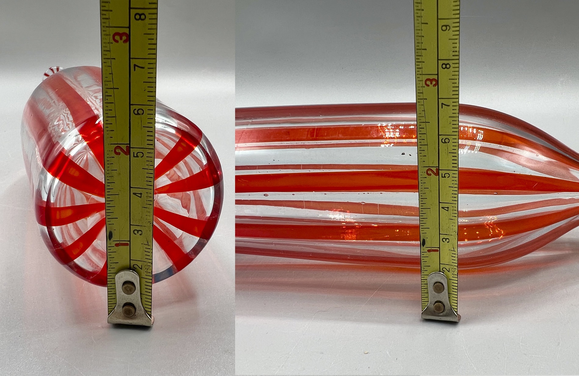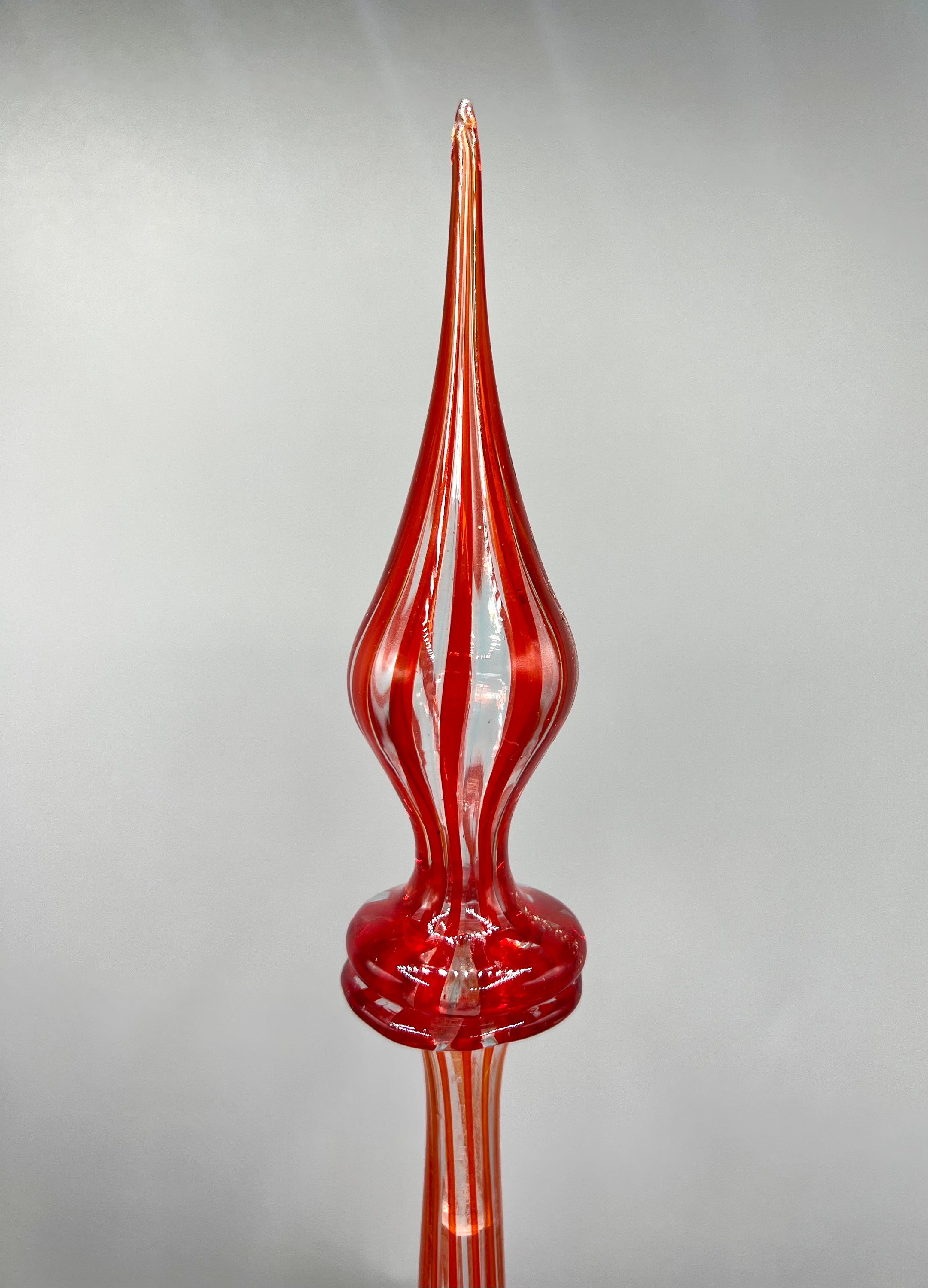 Amazing large bottle or decanter with fine Murano glass decorated in the 'a canne' or 'filigree' style with red and transparent stripes. At the base of the decanter you can see the pontil mark as it is a handmade and unique piece. It is undoubtedly the work of some great artisan or Murano glassmaker such as Fratelli Toso, Venini, Barbini or another important glassworks in Italy.