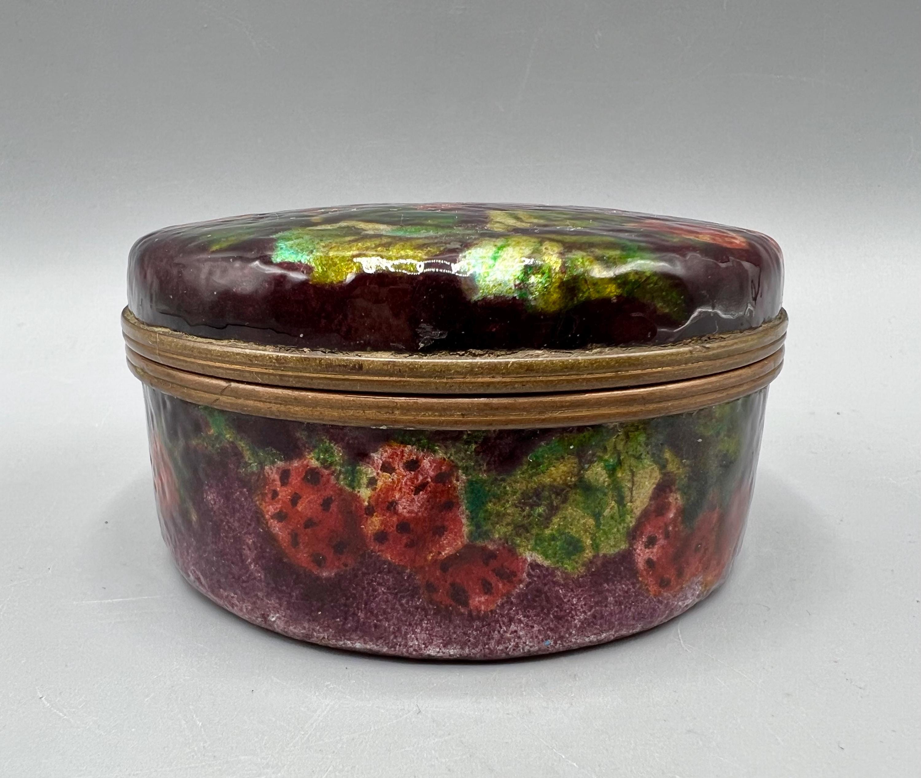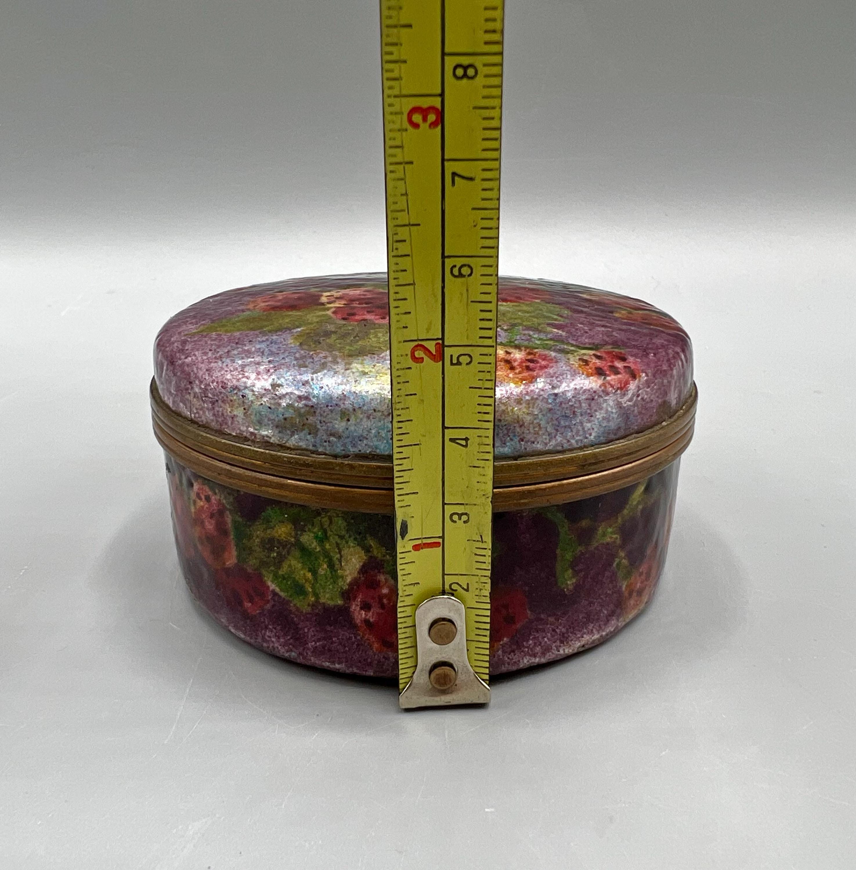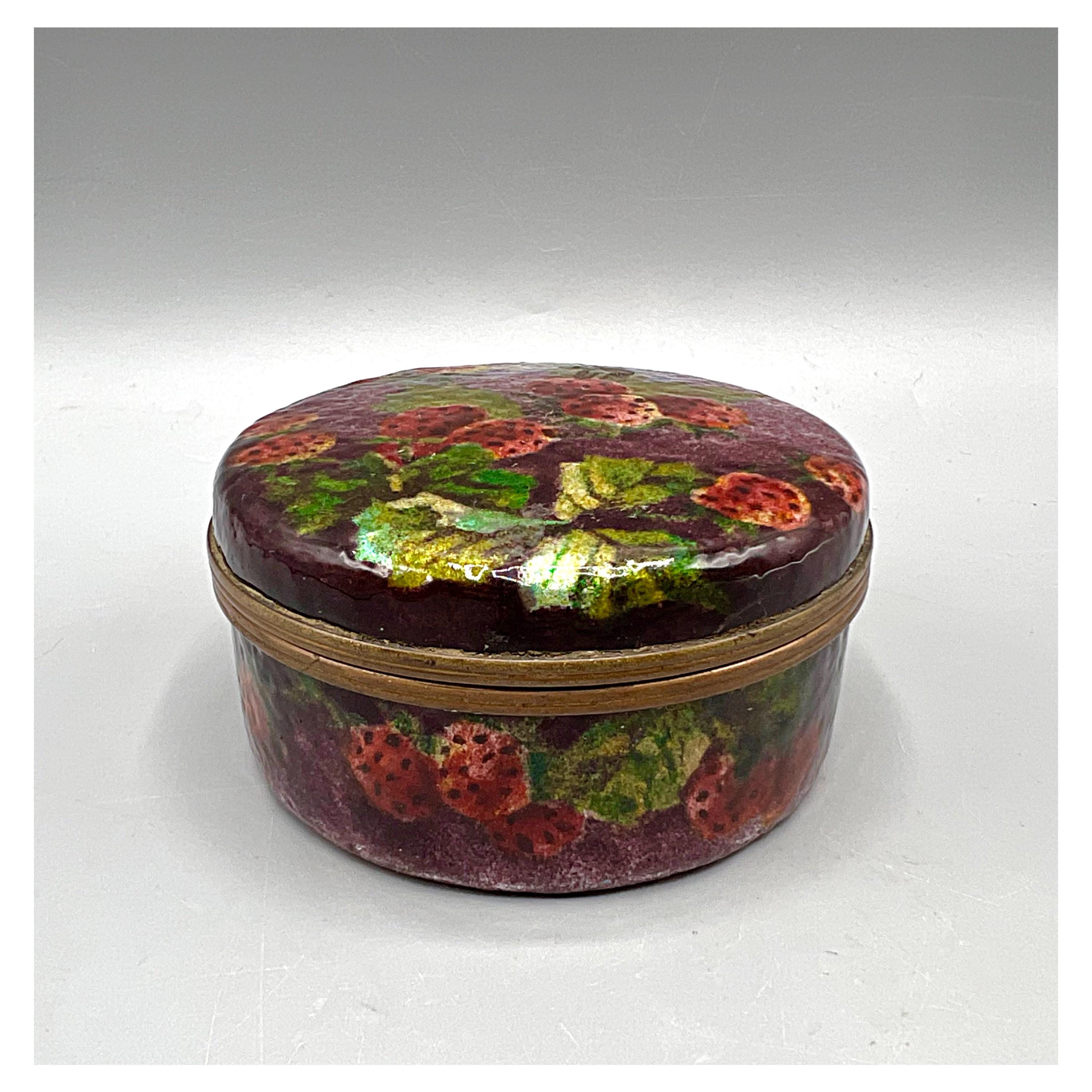 Precious box or small jewelery box enameled on fire with beautiful colors and subtle floral motifs with strawberries. Design by Jules Sarlandie for Limoges around 1920-30s.