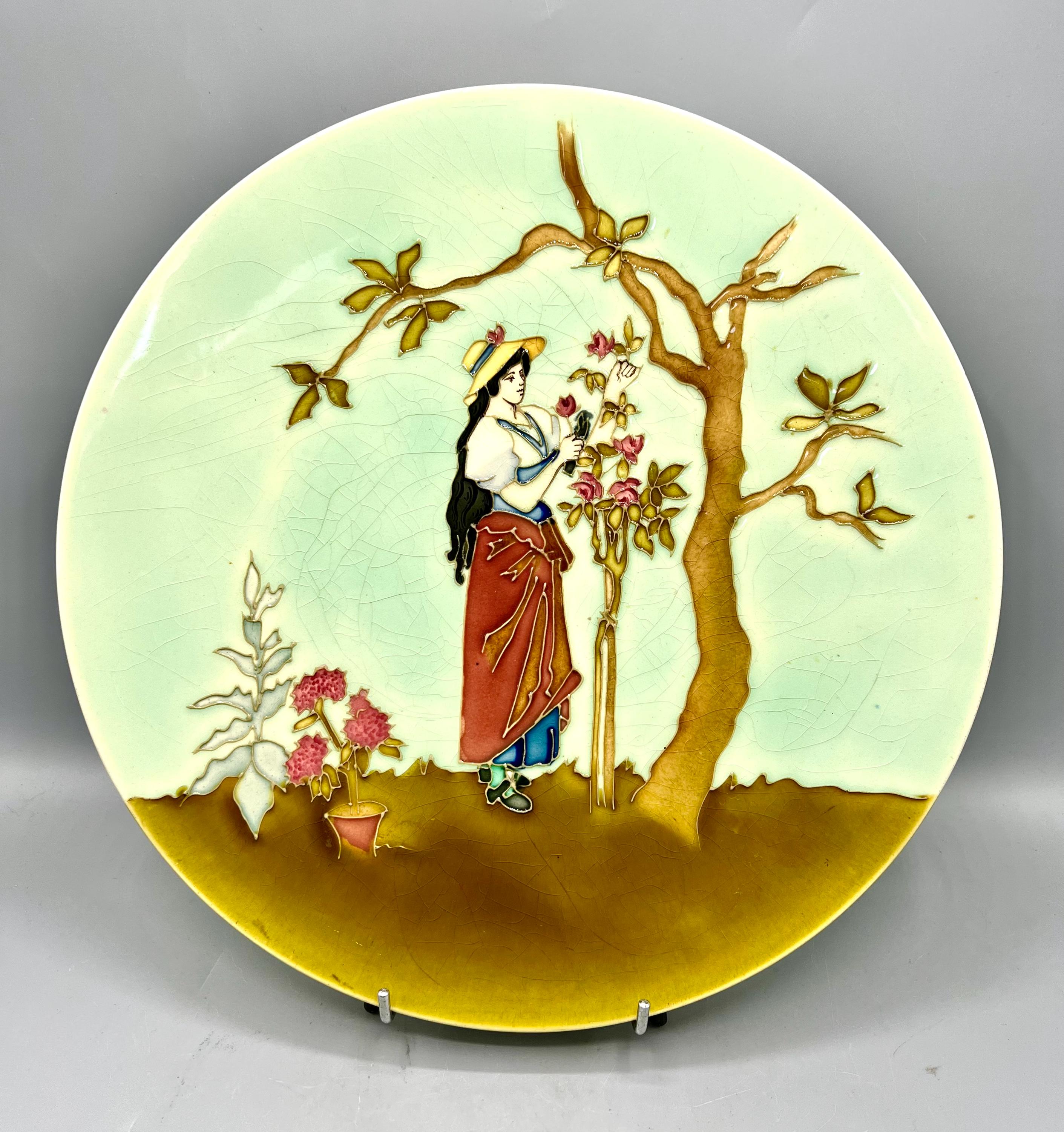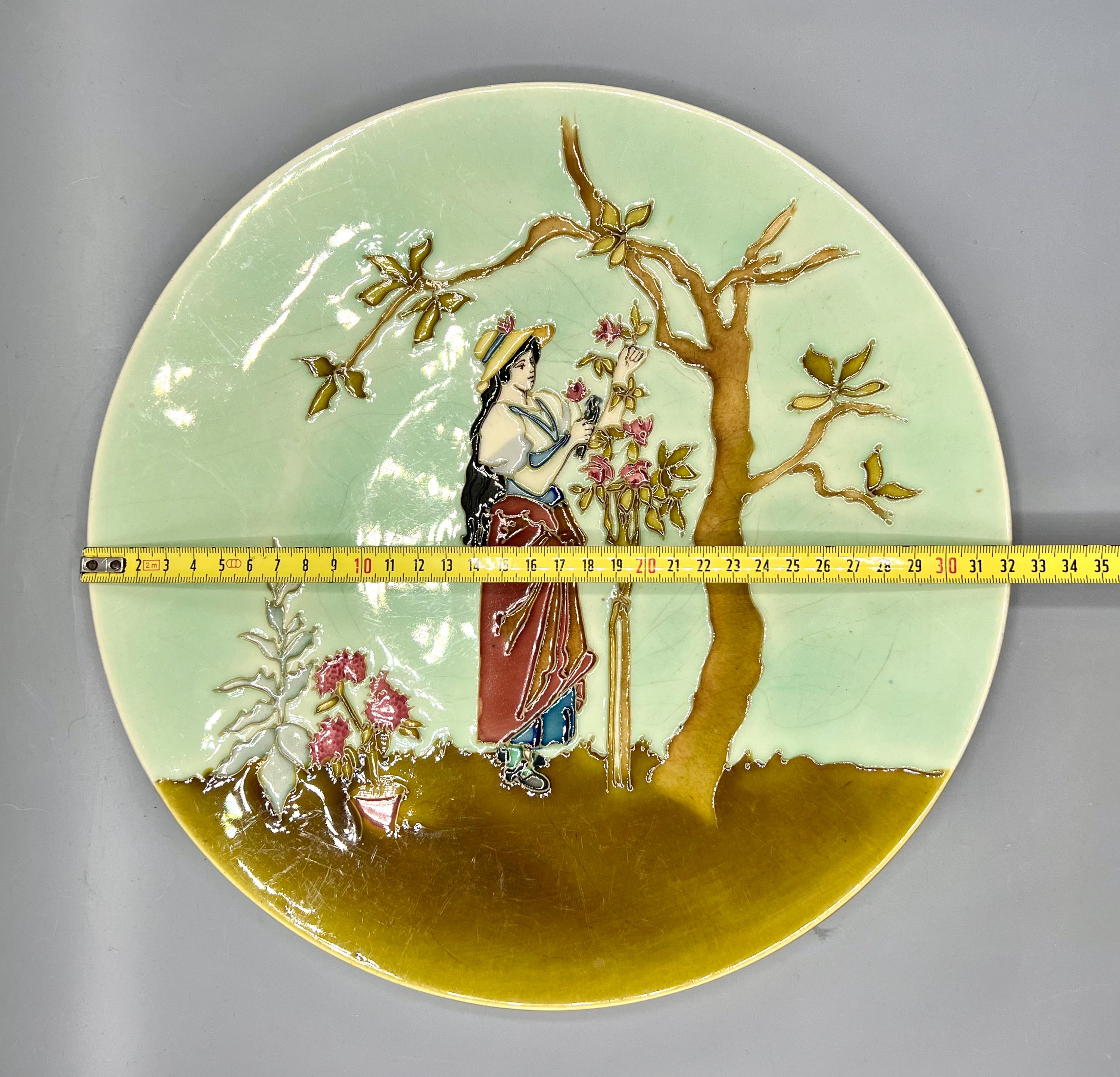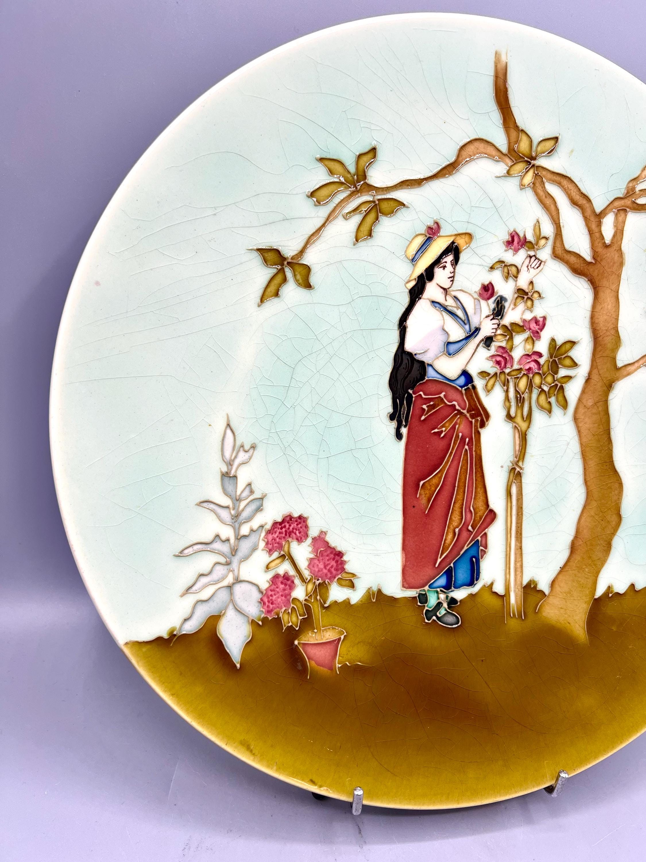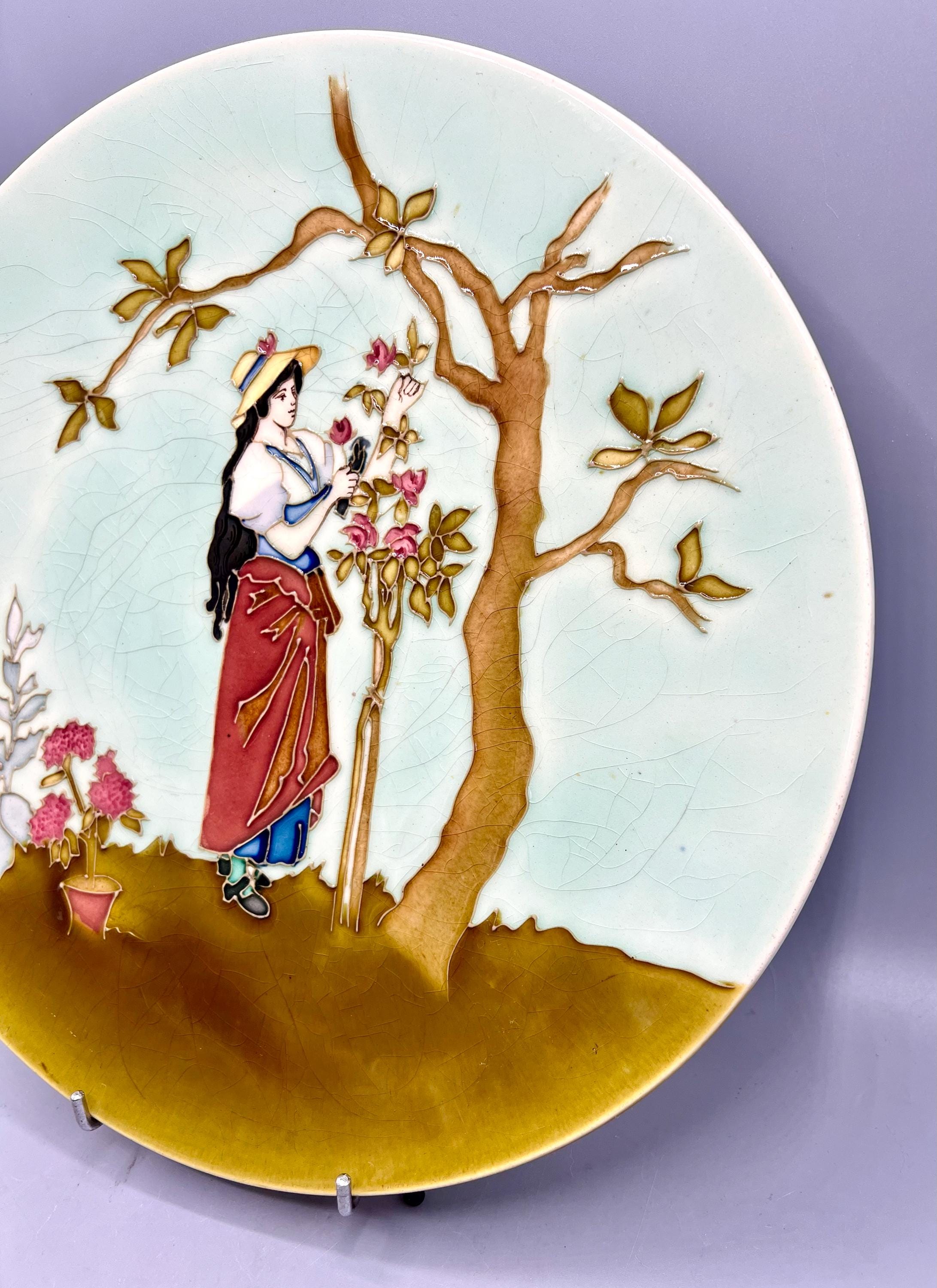 Beautiful decorative ceramic wall plate with a rural or country motif and a ceramic technique imitating "cloisonné." A rather rare model produced by Longchamp (France) around the late 19th or early 20th century.