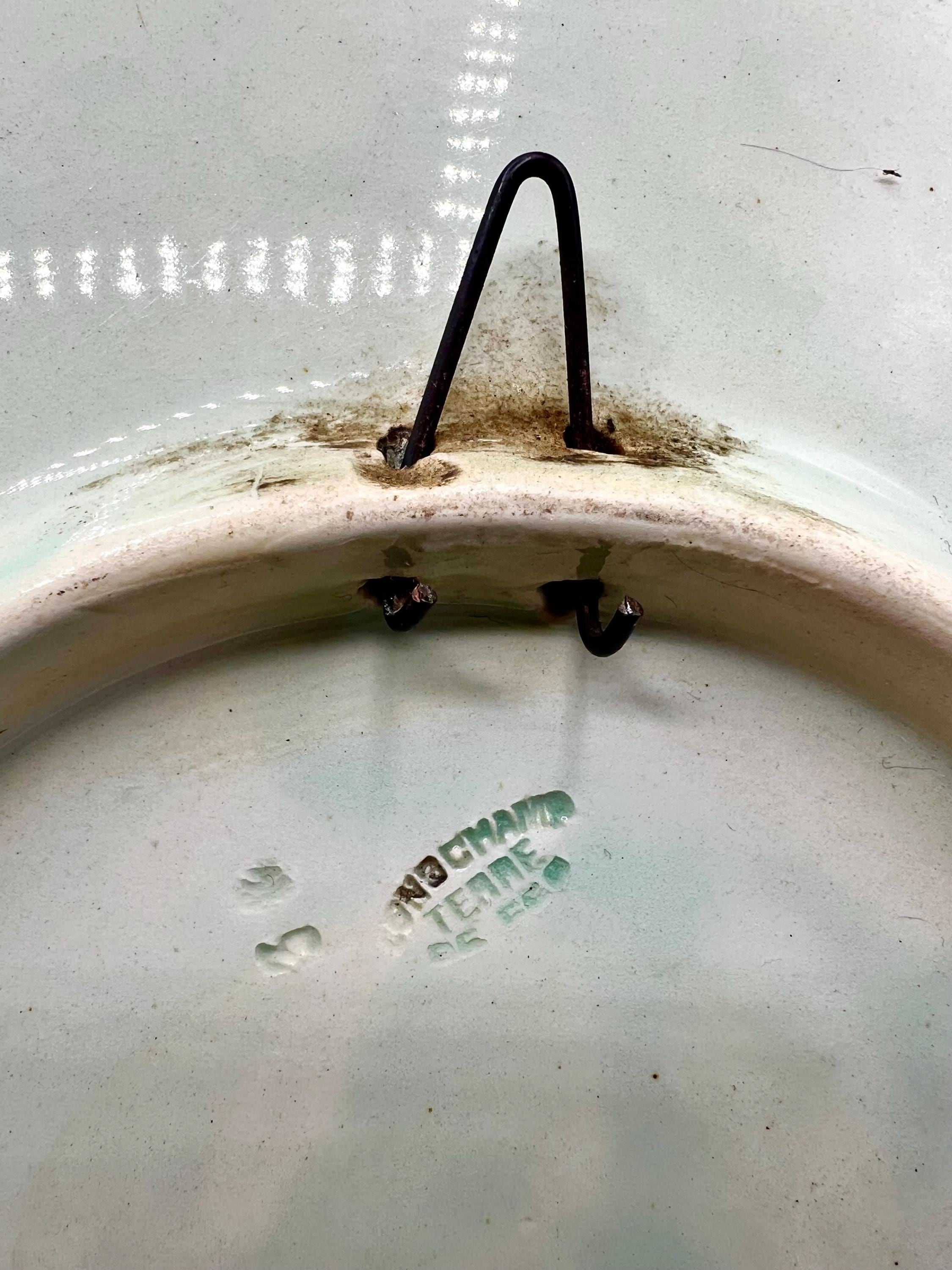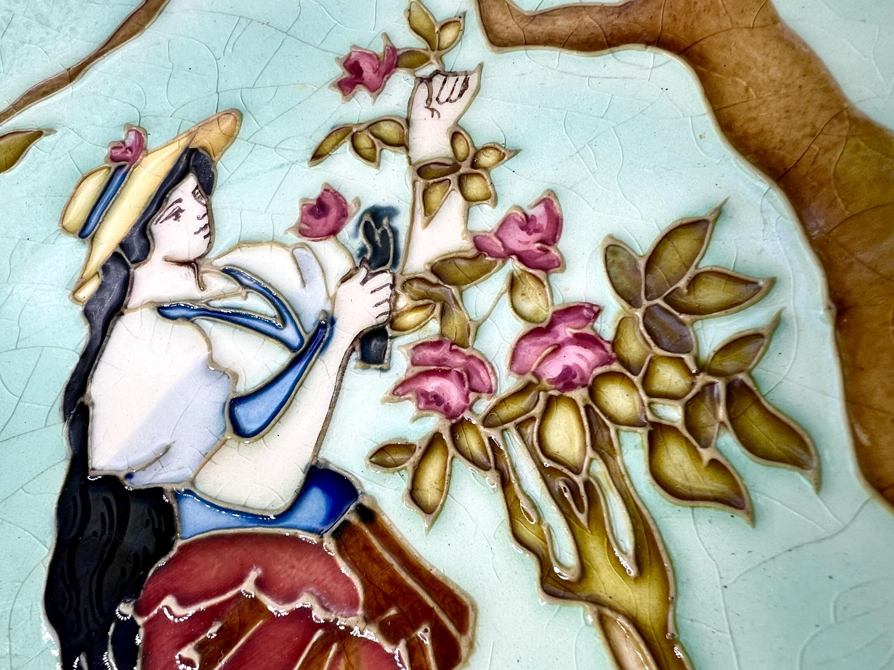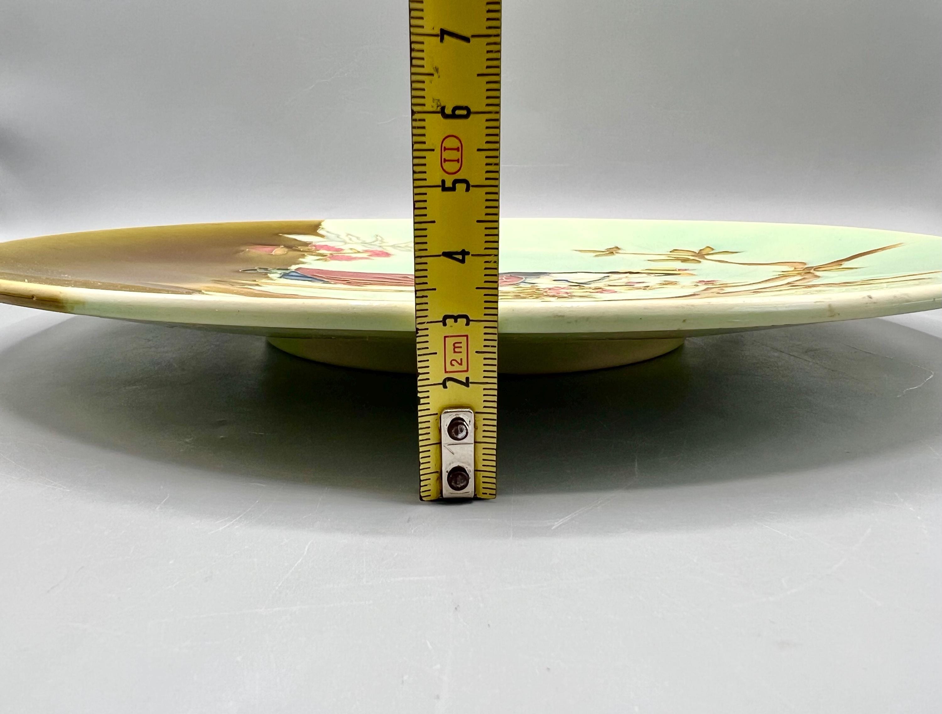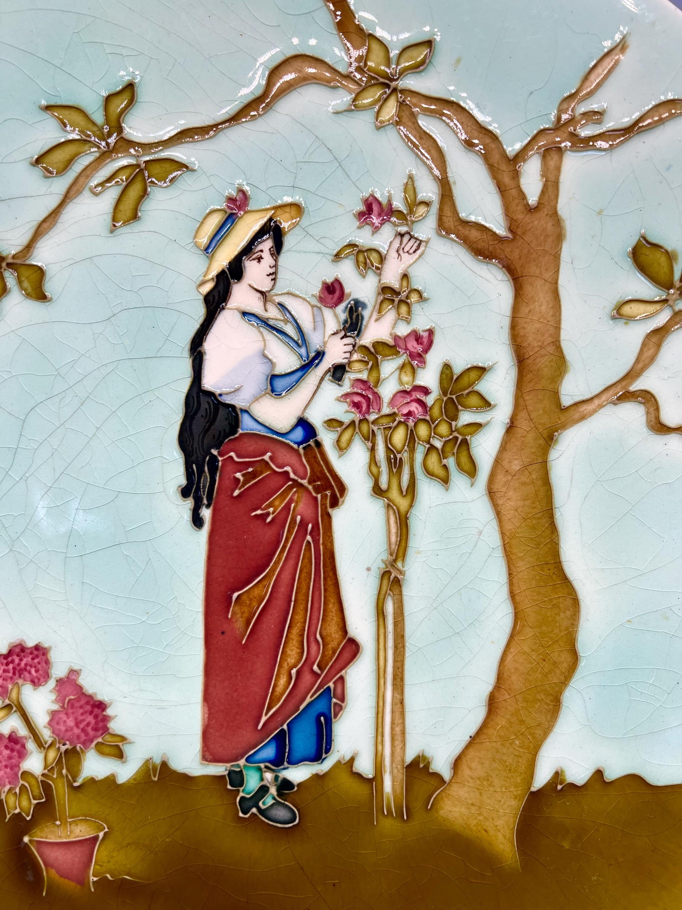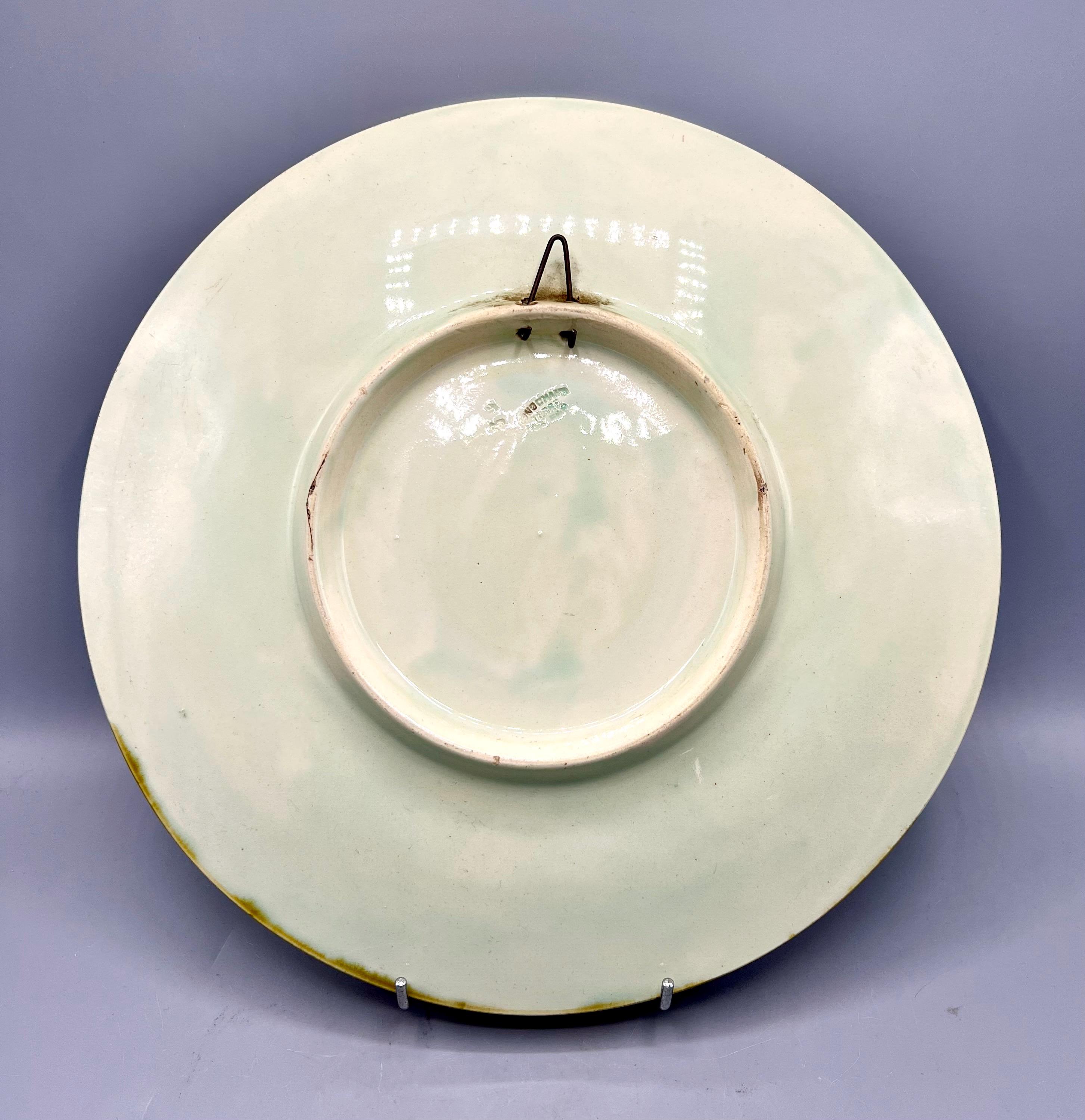 Beautiful decorative ceramic wall plate with a rural or country motif and a ceramic technique imitating "cloisonné." A rather rare model produced by Longchamp (France) around the late 19th or early 20th century.