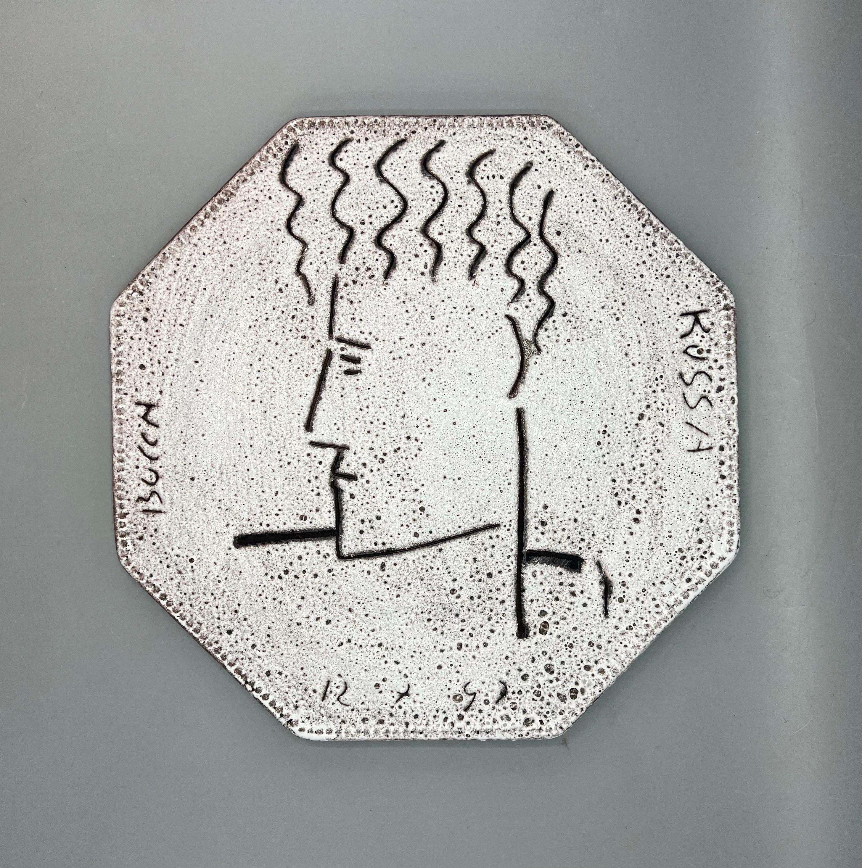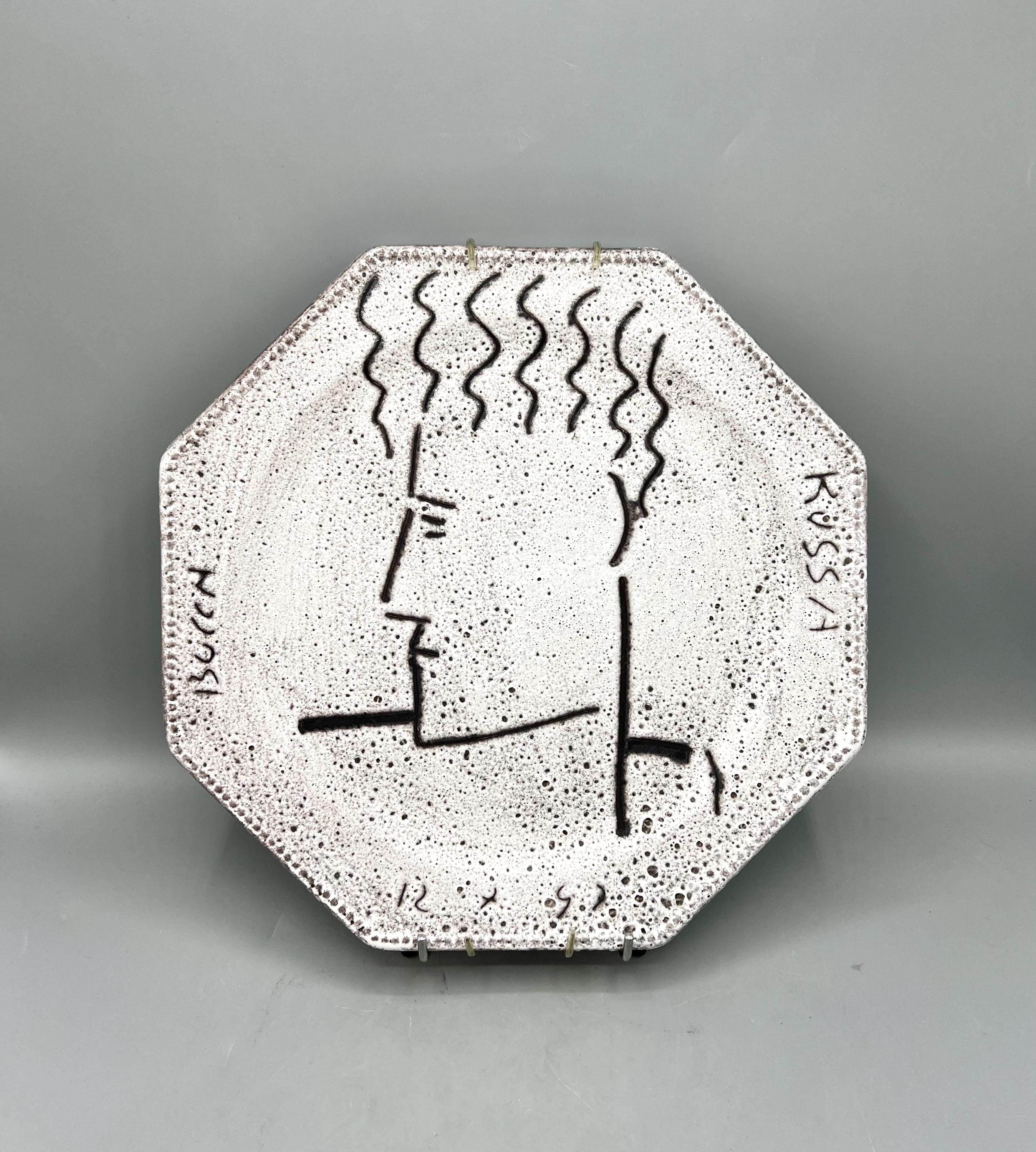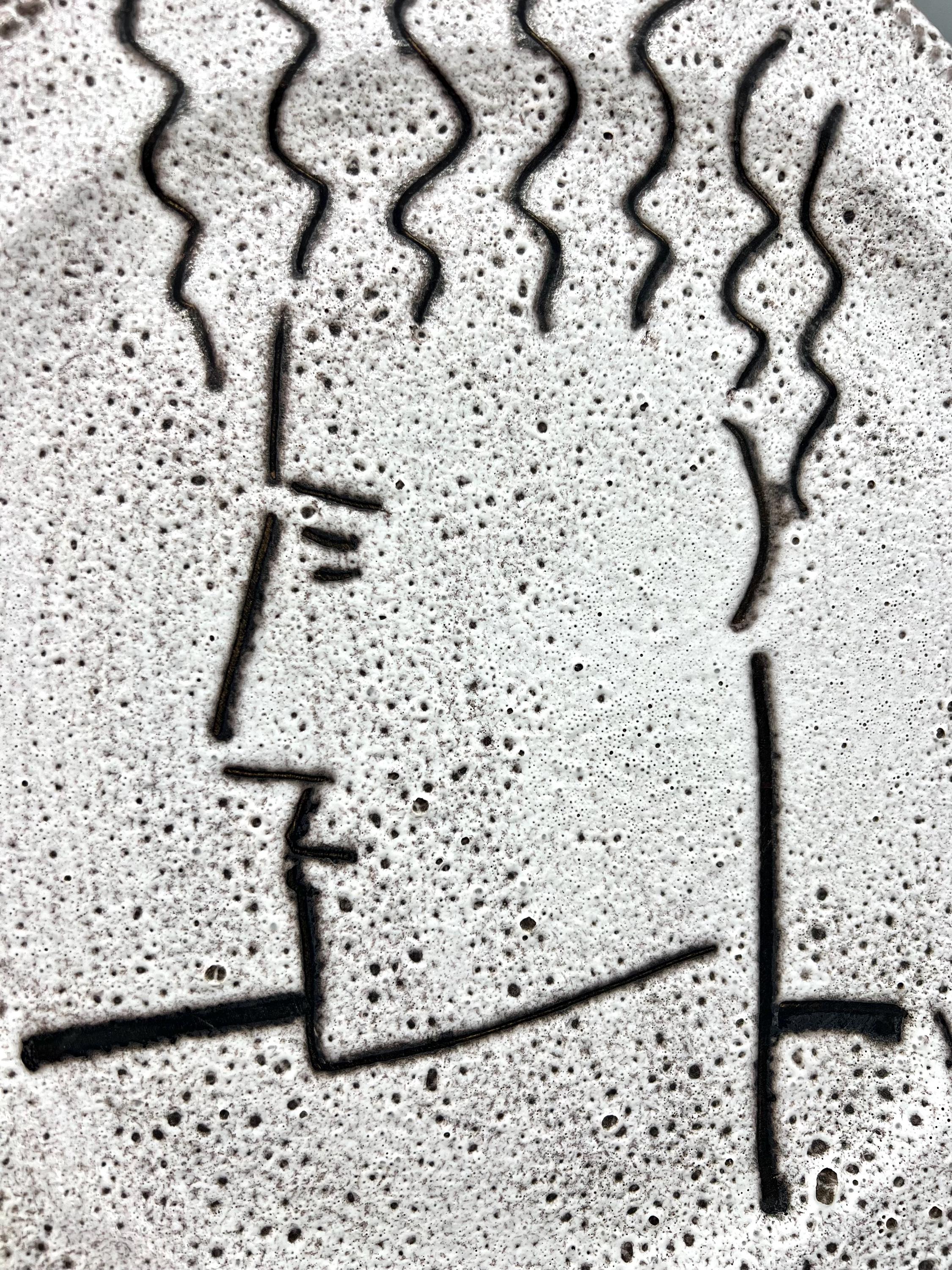 Original decorative ceramic wall plate featuring a face design and a lava-style ceramic finish. Created by the German artist Patrick Bocca Rossa in the late 1990s. Dated on the bottom.