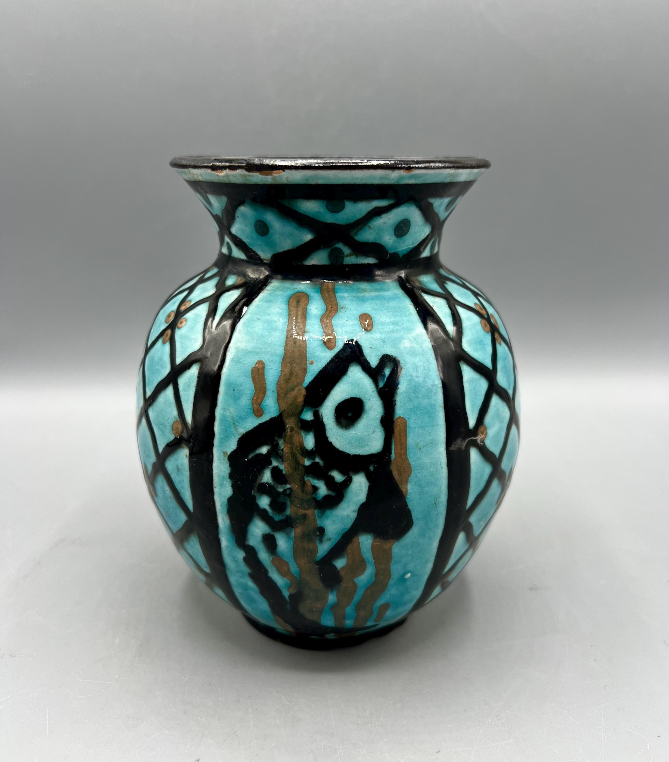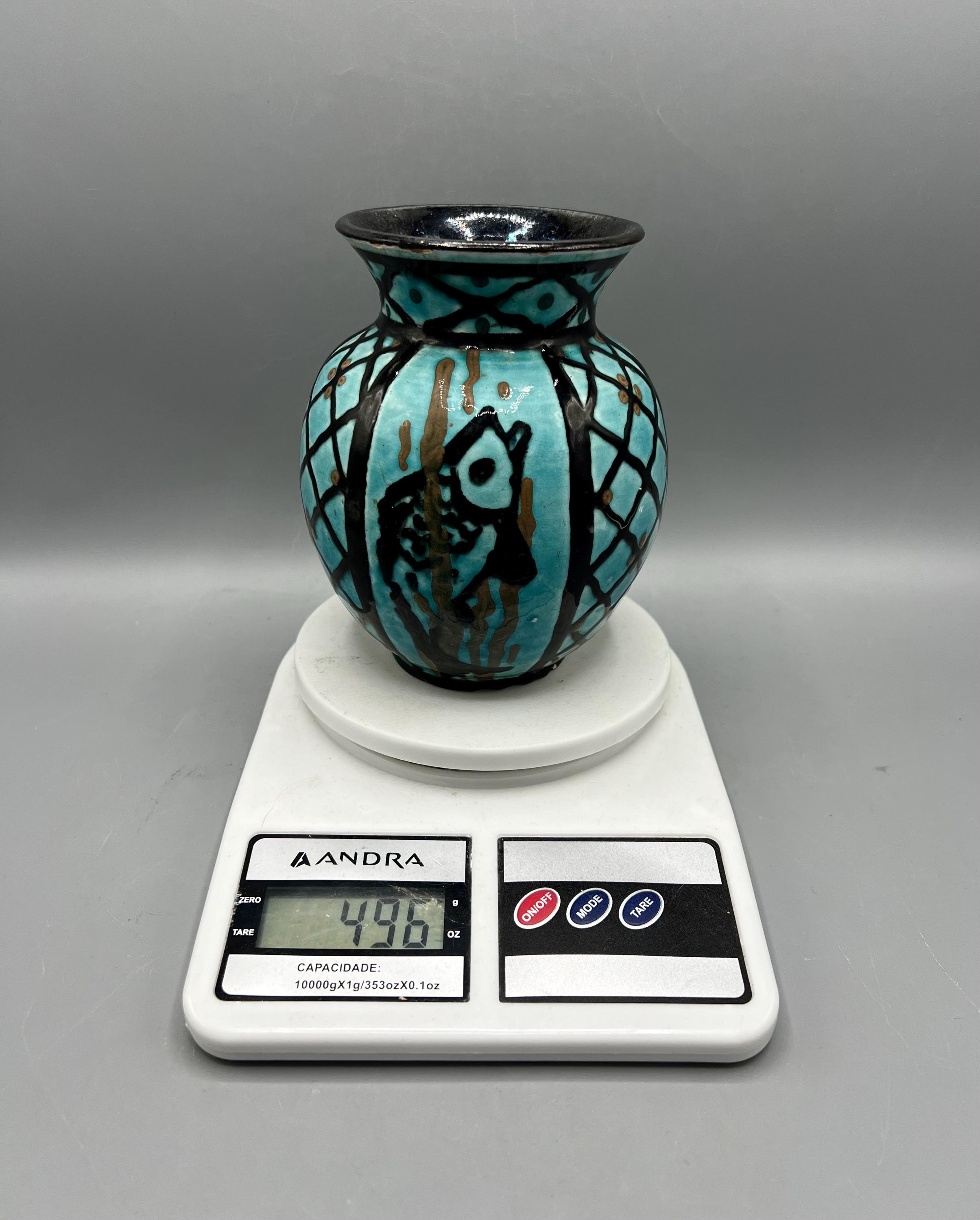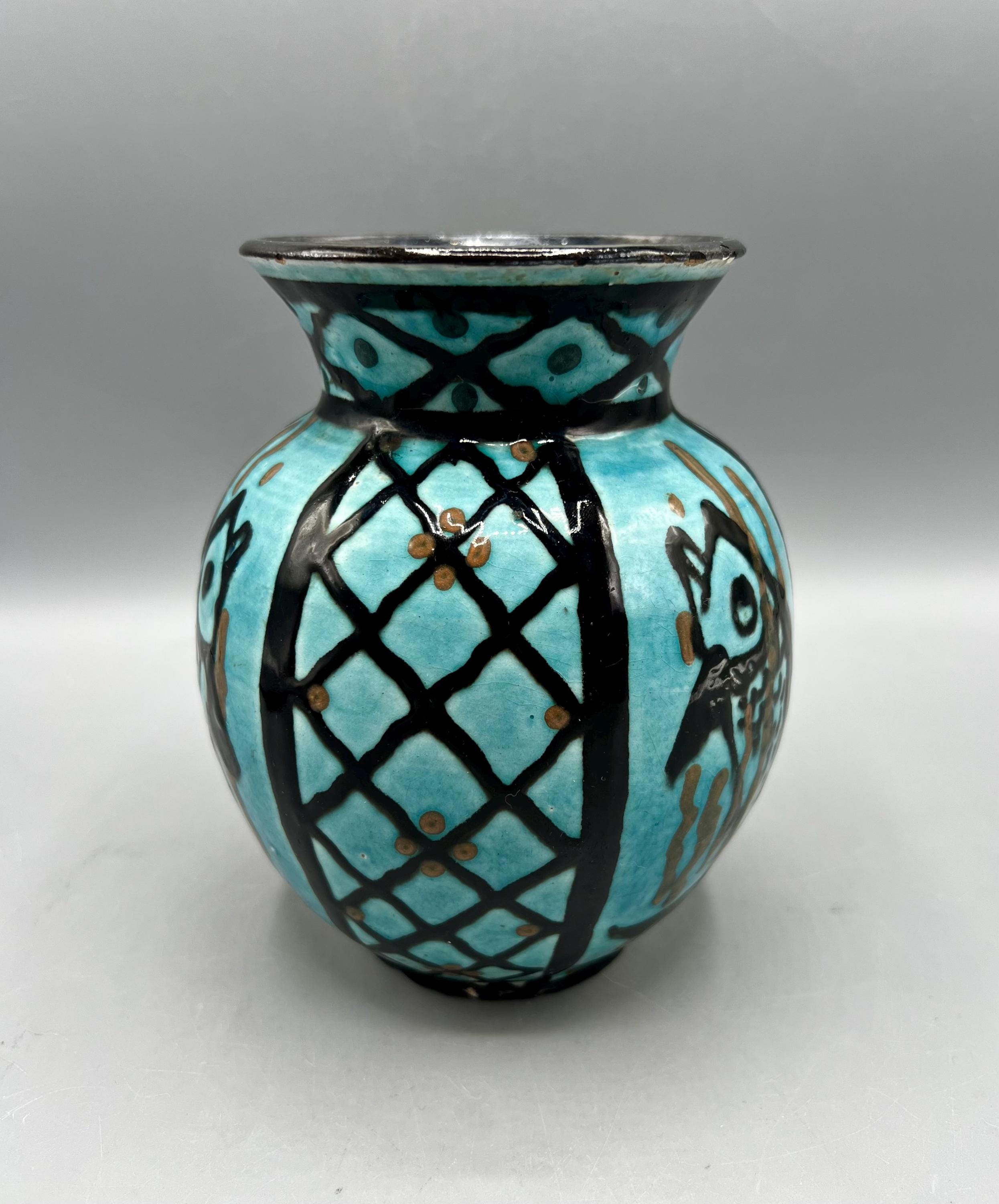 A beautiful small ceramic vase with a wide mouth, decorated with fish and geometric motifs inspired by African art and ancient civilizations. The vase is the work of the renowned international ceramist Paul Jacquet, who won a gold medal at the Exposition of Decorative Arts in Paris in 1925. This vase was likely made in his own workshop in the late 1920s. Later, the artist began working with the Primavera workshops. An extremely rare piece.