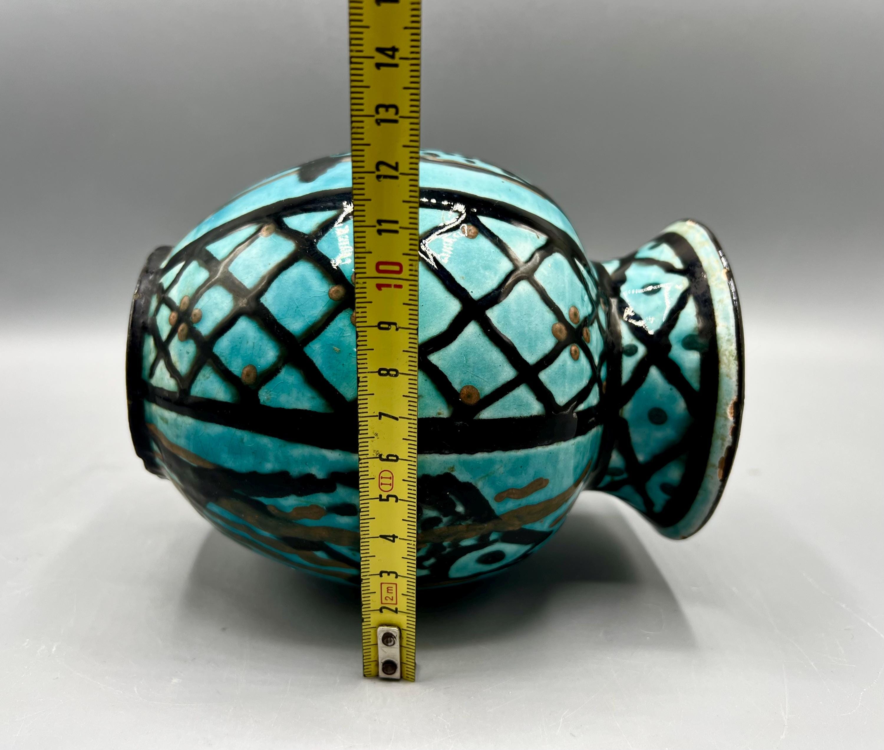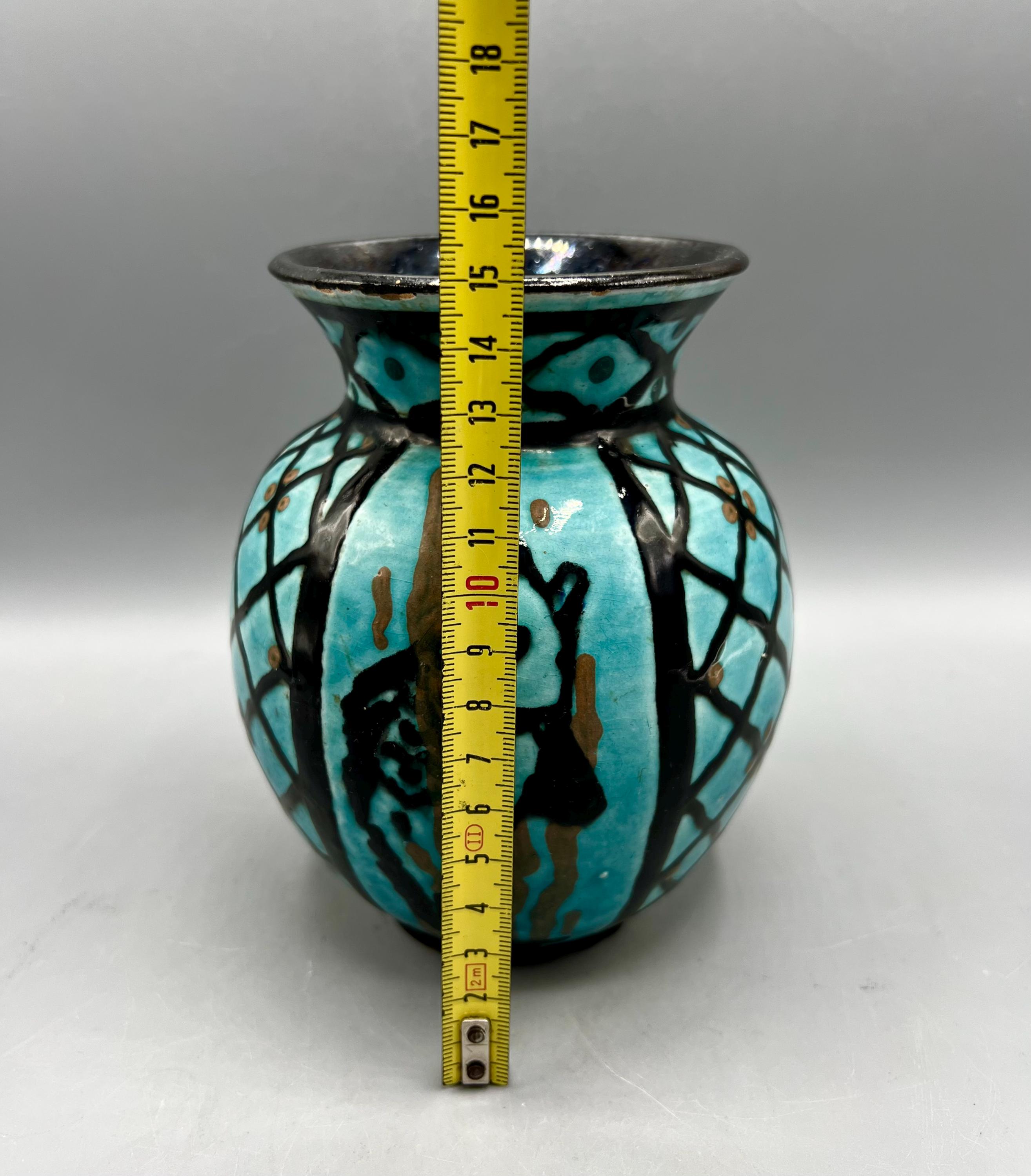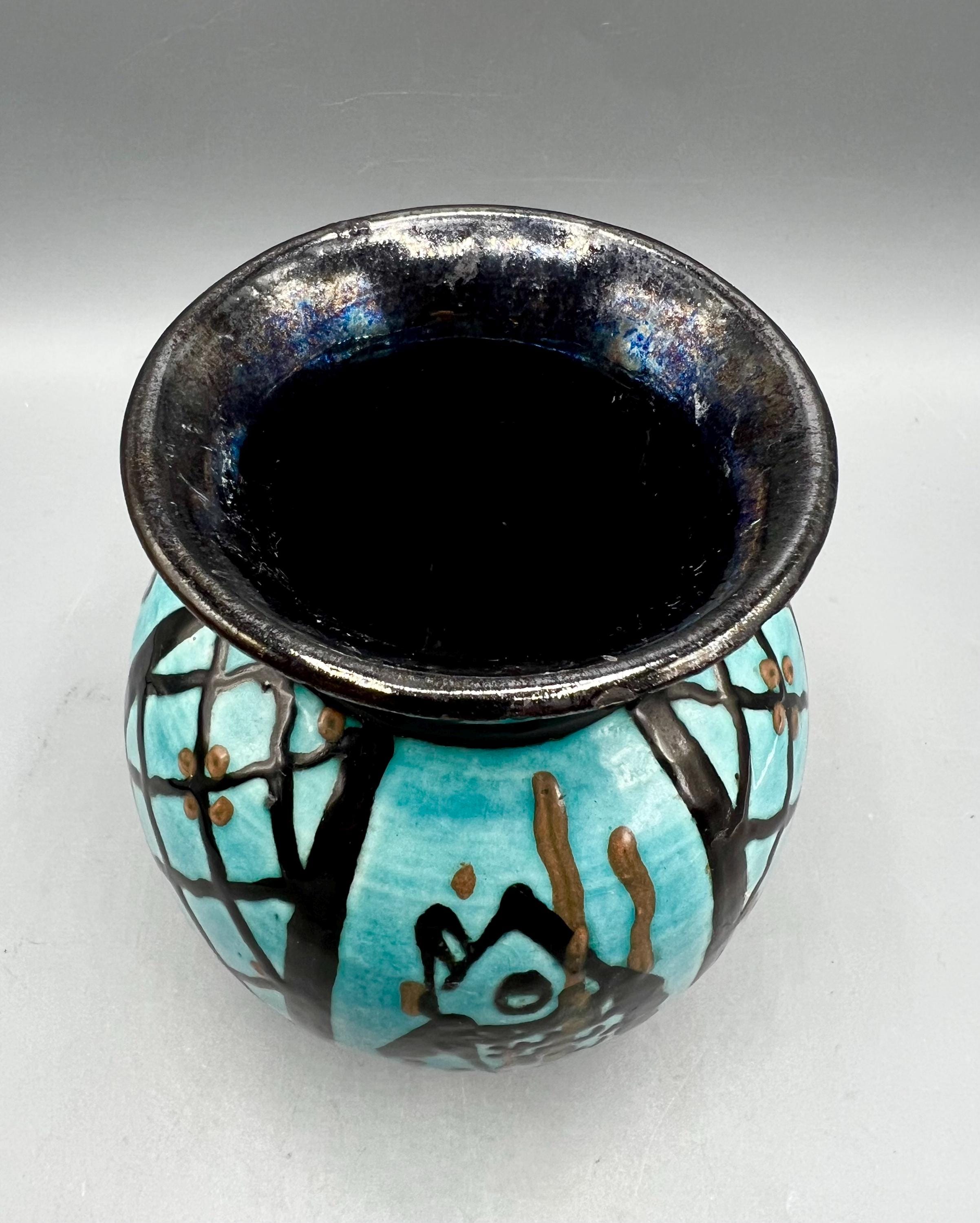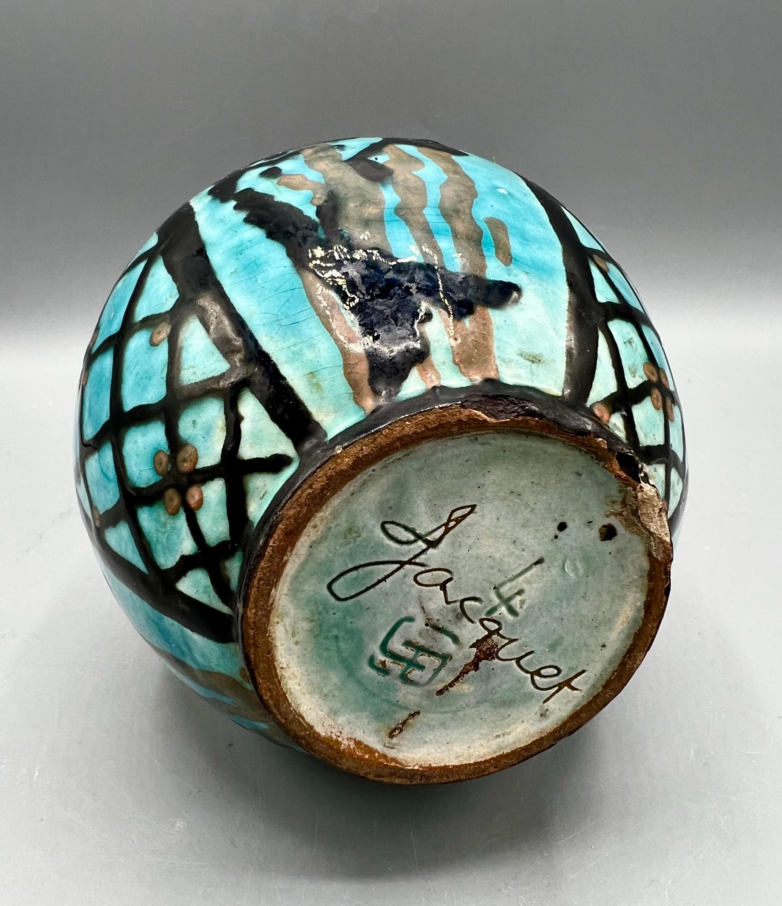 A beautiful small ceramic vase with a wide mouth, decorated with fish and geometric motifs inspired by African art and ancient civilizations. The vase is the work of the renowned international ceramist Paul Jacquet, who won a gold medal at the Exposition of Decorative Arts in Paris in 1925. This vase was likely made in his own workshop in the late 1920s. Later, the artist began working with the Primavera workshops. An extremely rare piece.