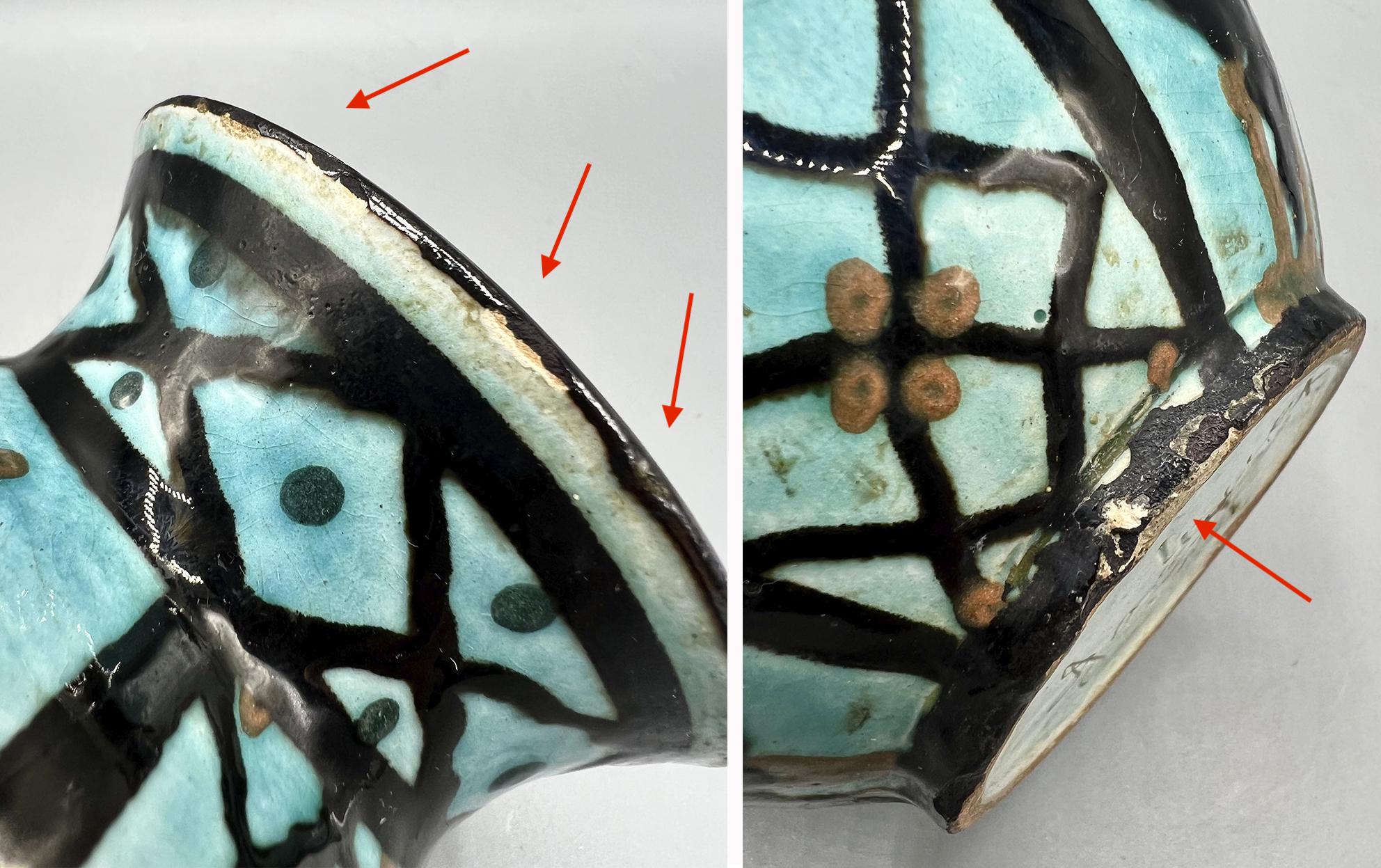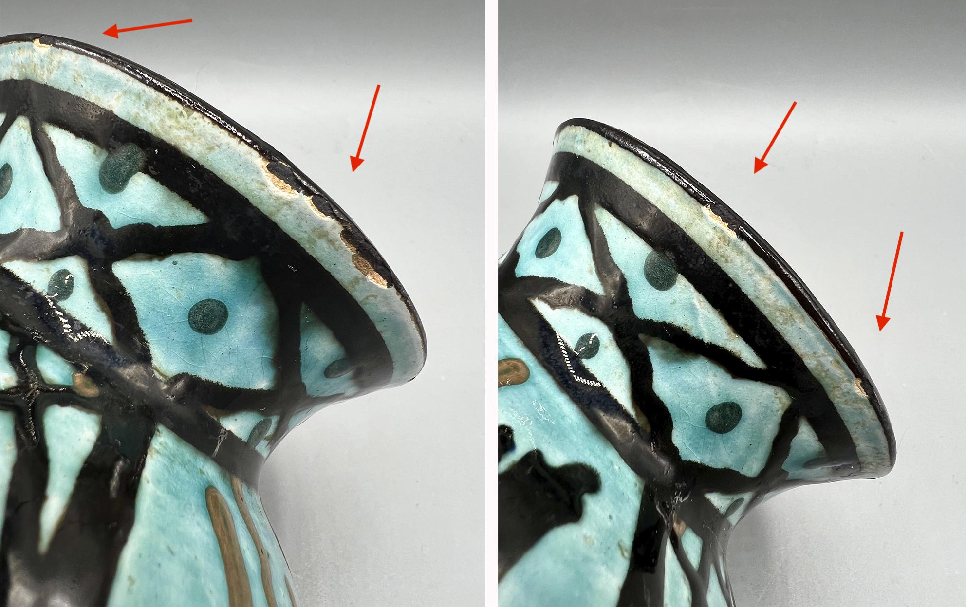 Good overall condition. Minor age chips on the upper rim and base. The most noticeable chips are shown in detail in the photographs.