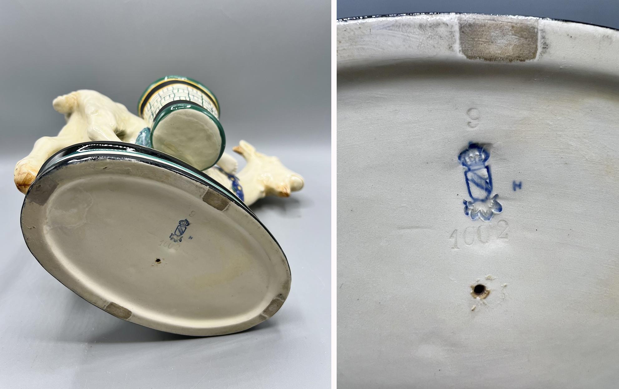 I want to emphasize and state my transparency and most sincere, humble opinion regarding this particular piece. This sculptural model is known and/or identified by the registration number 1003, and this number is engraved on the back of the base of these models. Therefore, the model offered should have this number engraved on it, but it does not. The piece offered in this listing has the number 1002 engraved on it. This is very strange and leads one to believe that it is obviously a copy. But honestly, and from my humble but by no means ignorant opinion, as I have been dealing with similar pieces from the Karlsruhe manufacturer for over 20 years, I can almost say with 99% certainty that this piece offered is not a mere copy. The quality of detail in its form, along with the color tones, its weight and dimensions, and the manufacturing process evidenced by the marks on the base, lead me to conclude that it is an original piece, albeit with a typographical error in the model's label at the time of engraving. Furthermore, this piece comes from a bourgeois home that housed exceptional works of art, and it was found in an abandoned room with a patina of dense dust that was difficult to remove. This is my conclusion. Any questions you may have are welcome and will be answered.