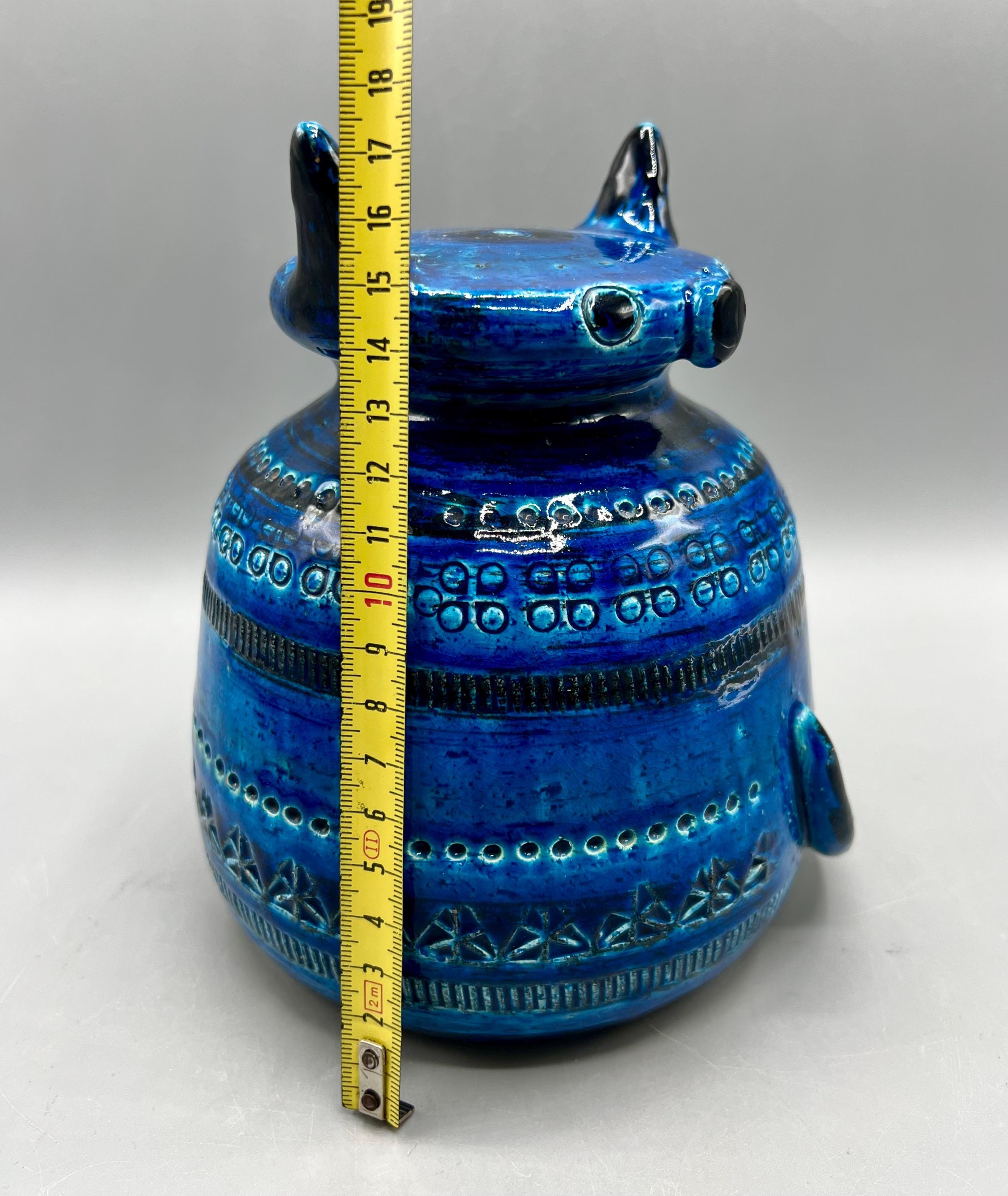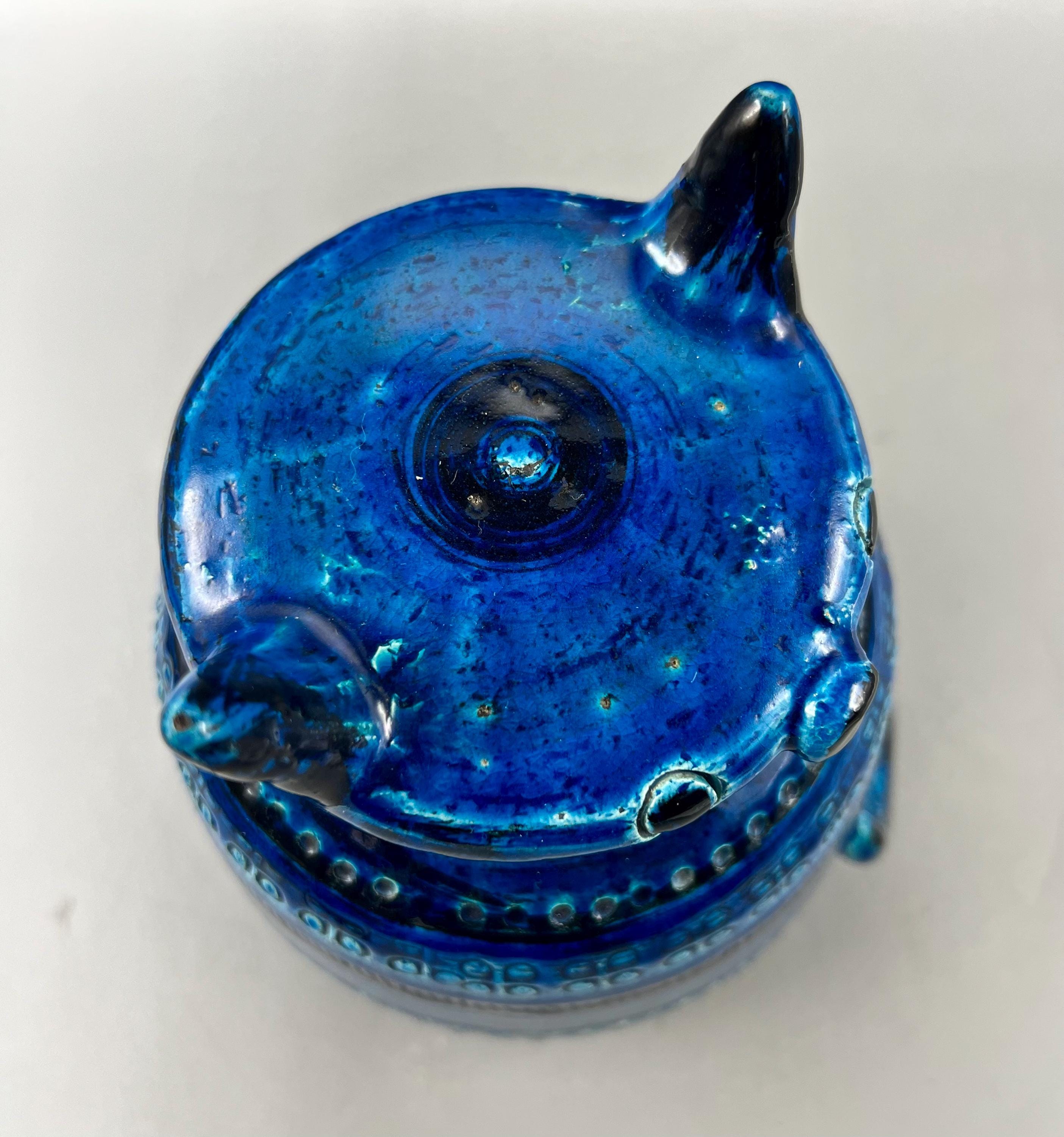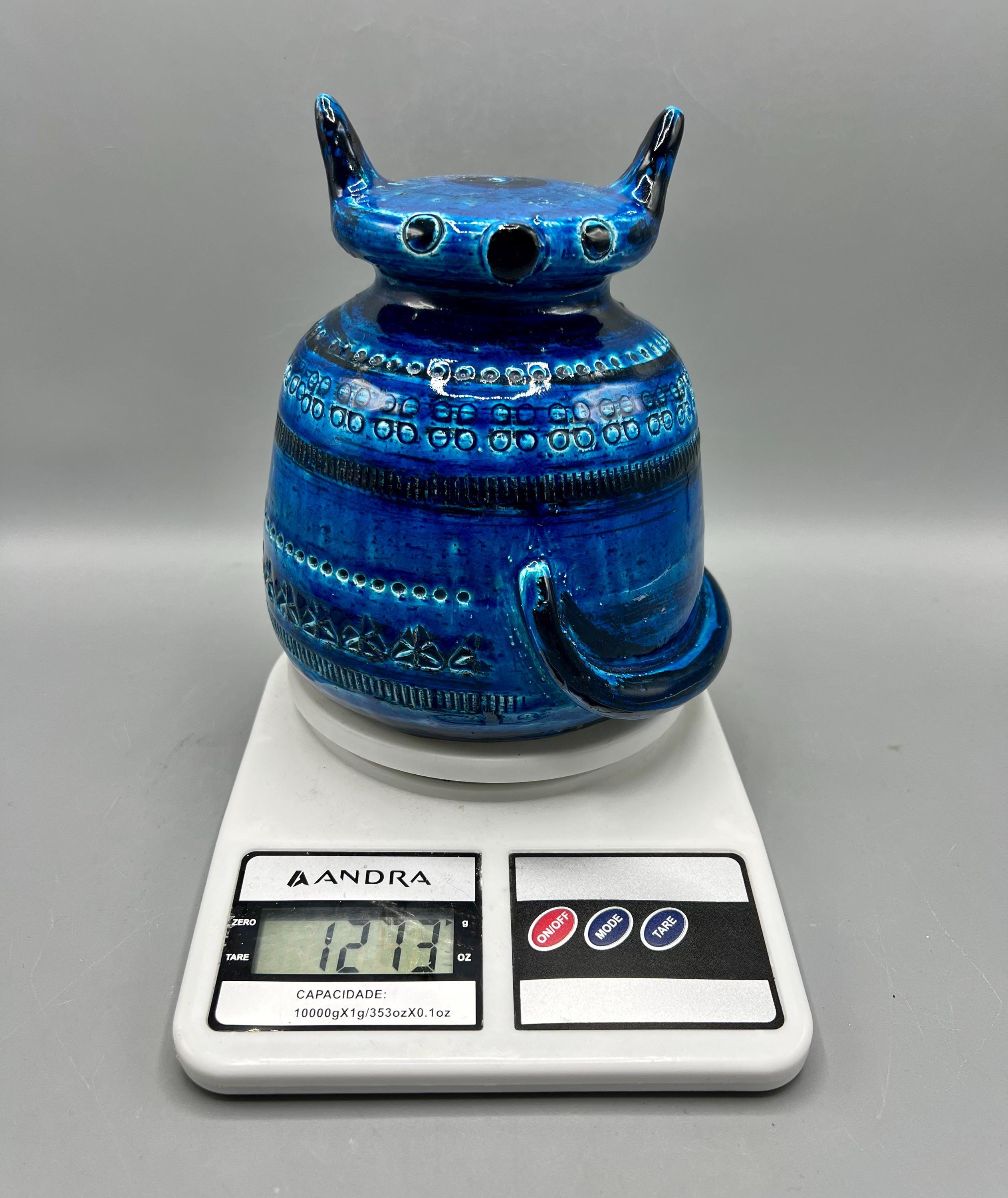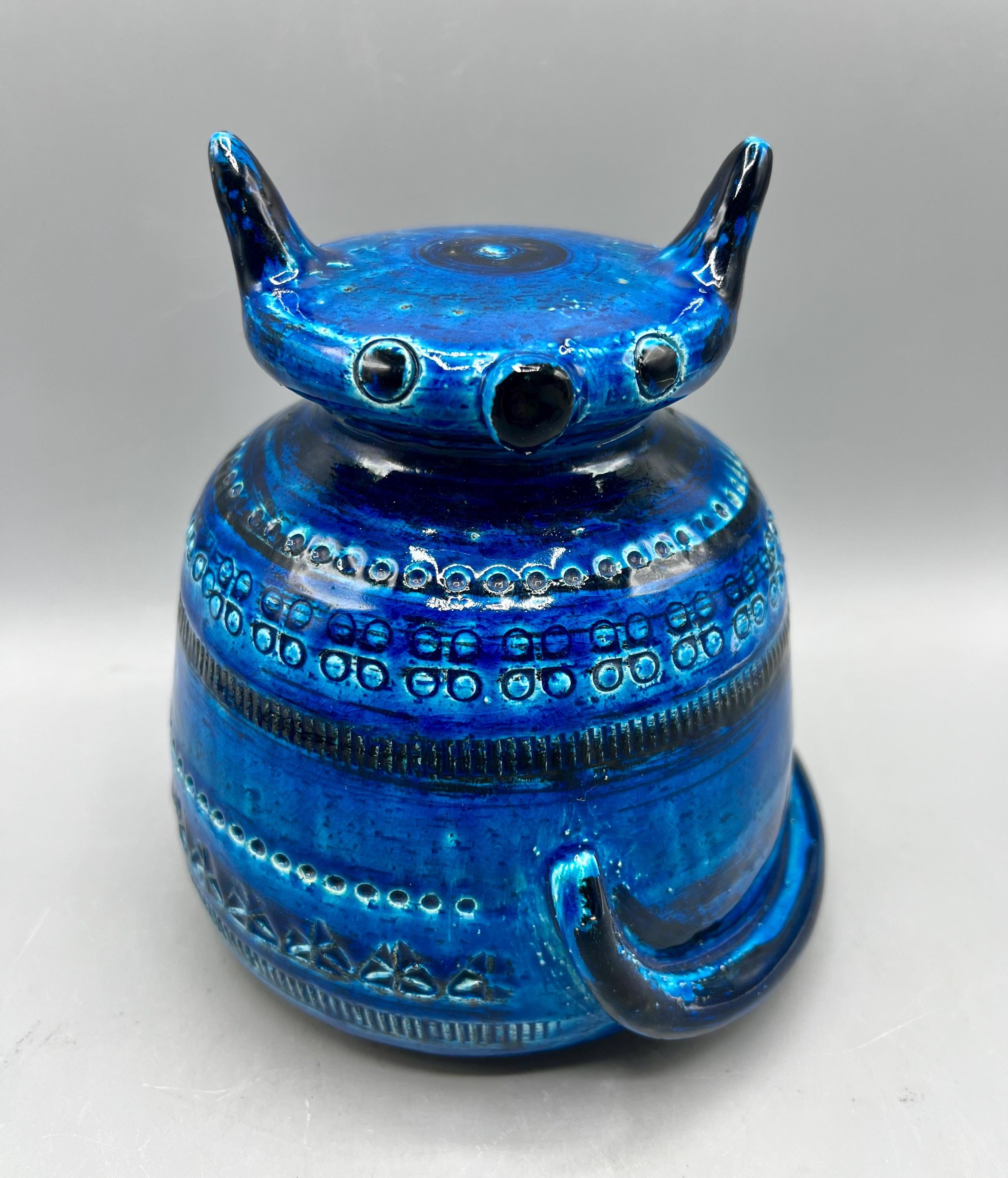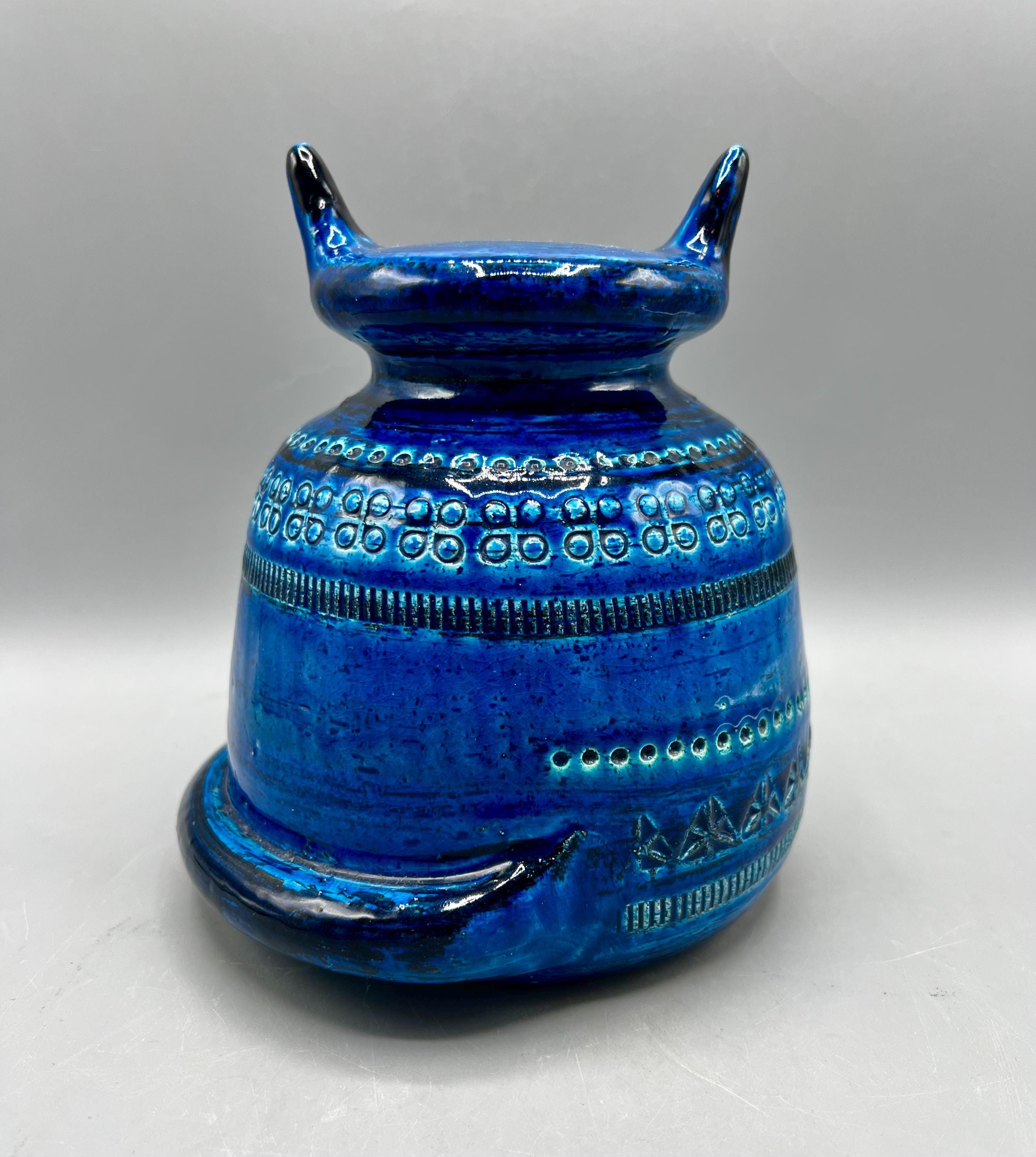 A beautiful figurine of a charming fat cat in glazed ceramic, designed by Aldo Londi for the Rimini Blu series and produced by Bitossi circa 1970s. An extremely rare model.