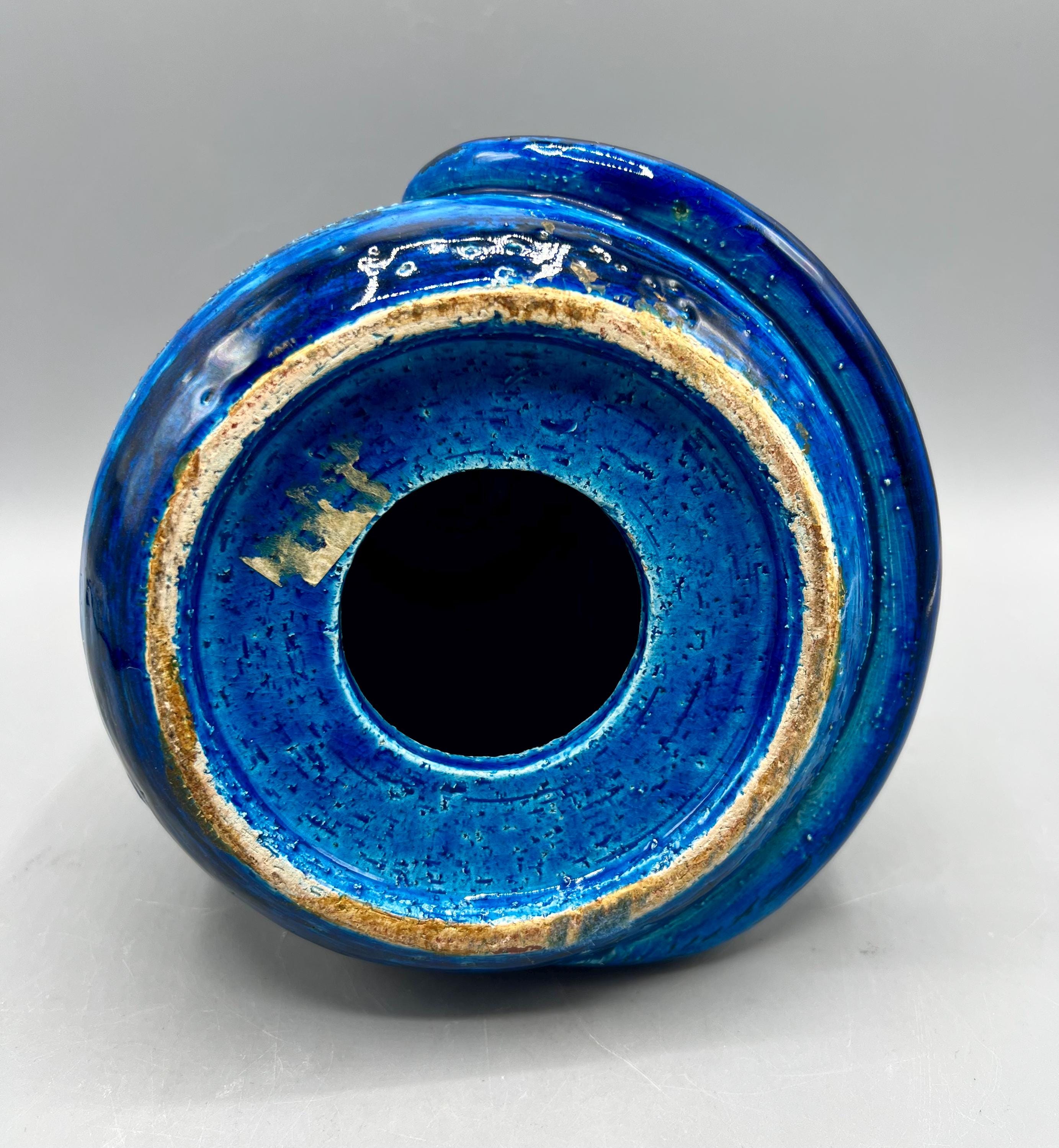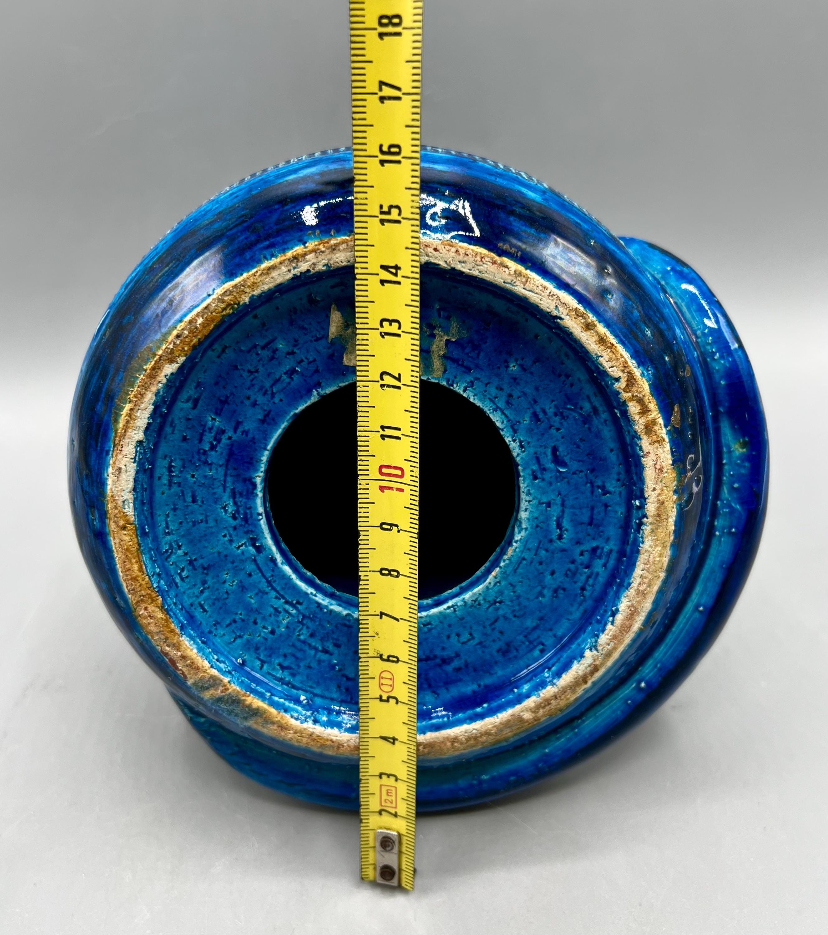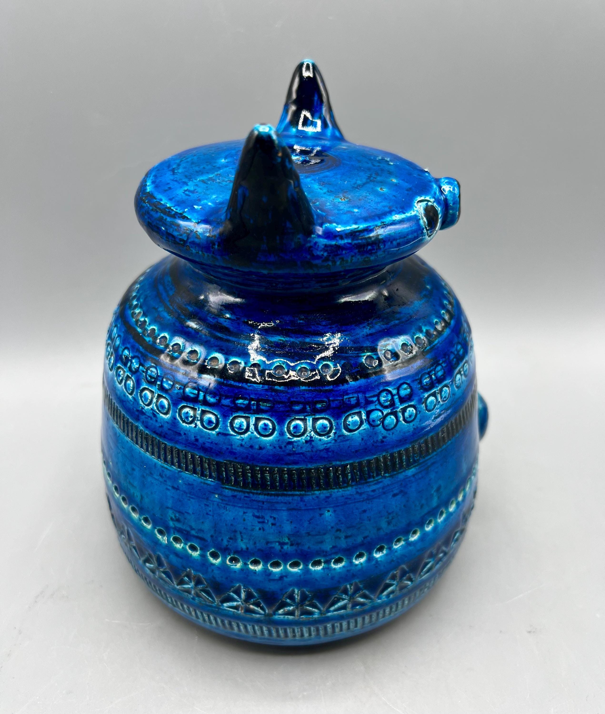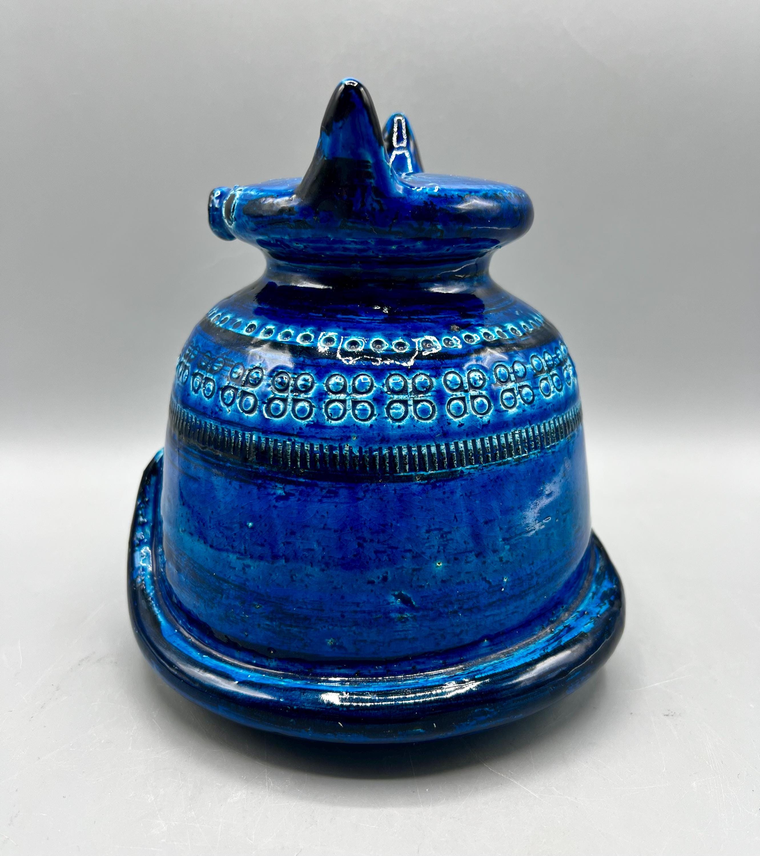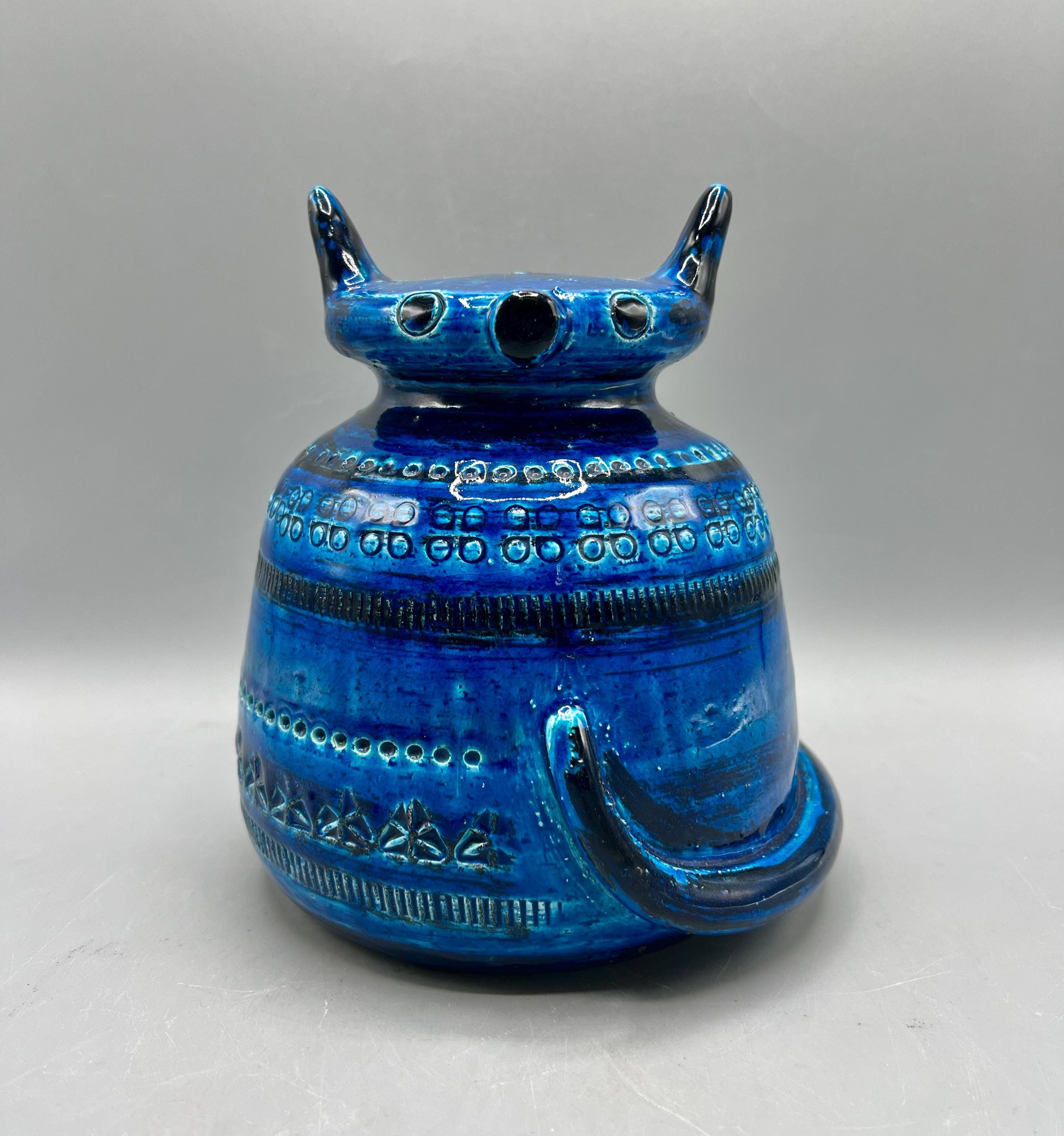 A beautiful figurine of a charming fat cat in glazed ceramic, designed by Aldo Londi for the Rimini Blu series and produced by Bitossi circa 1970s. An extremely rare model.