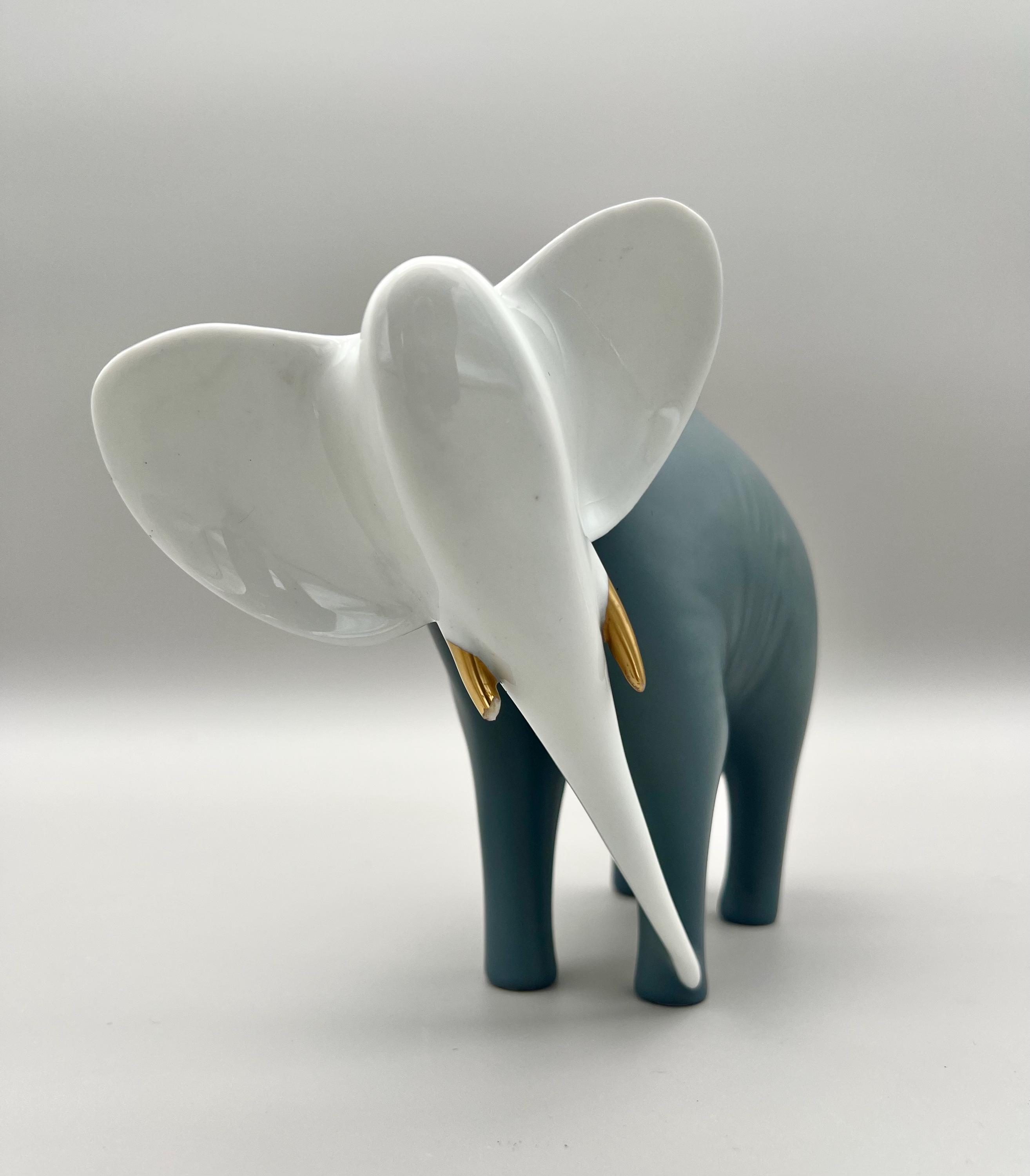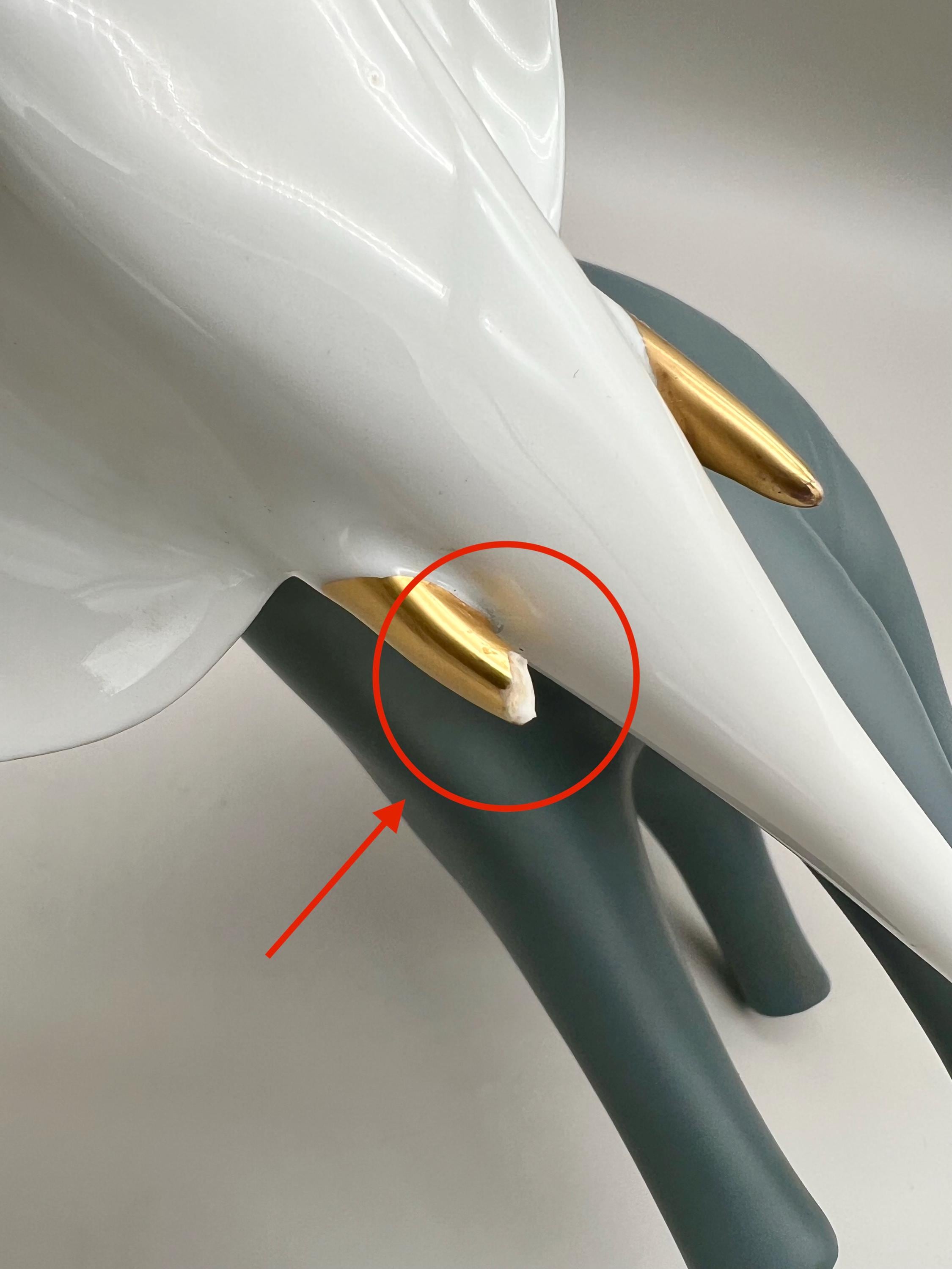 Unfortunately, the tip of one of the gilded tusks is broken. Its restoration is relatively simple. Otherwise, it is in perfect condition. See the detailed photograph.
